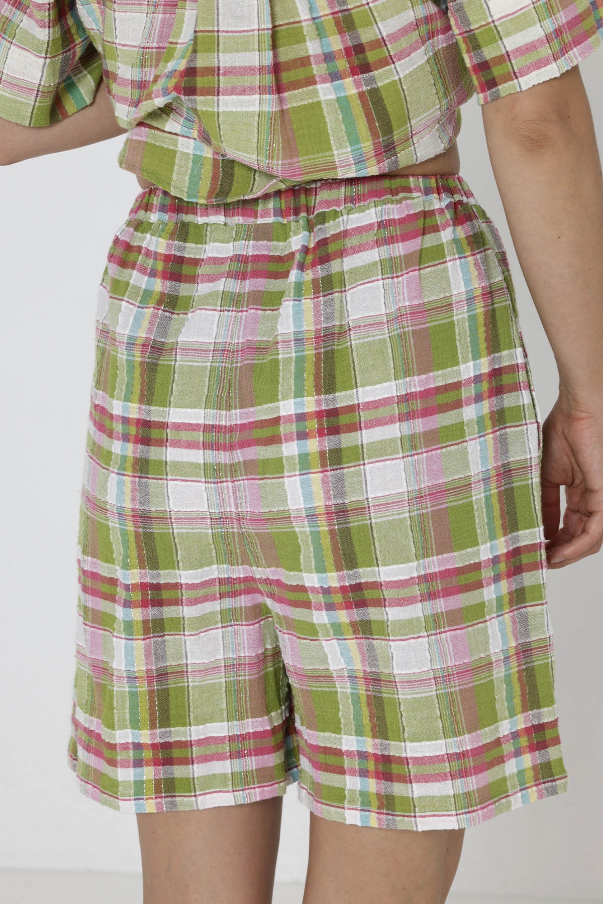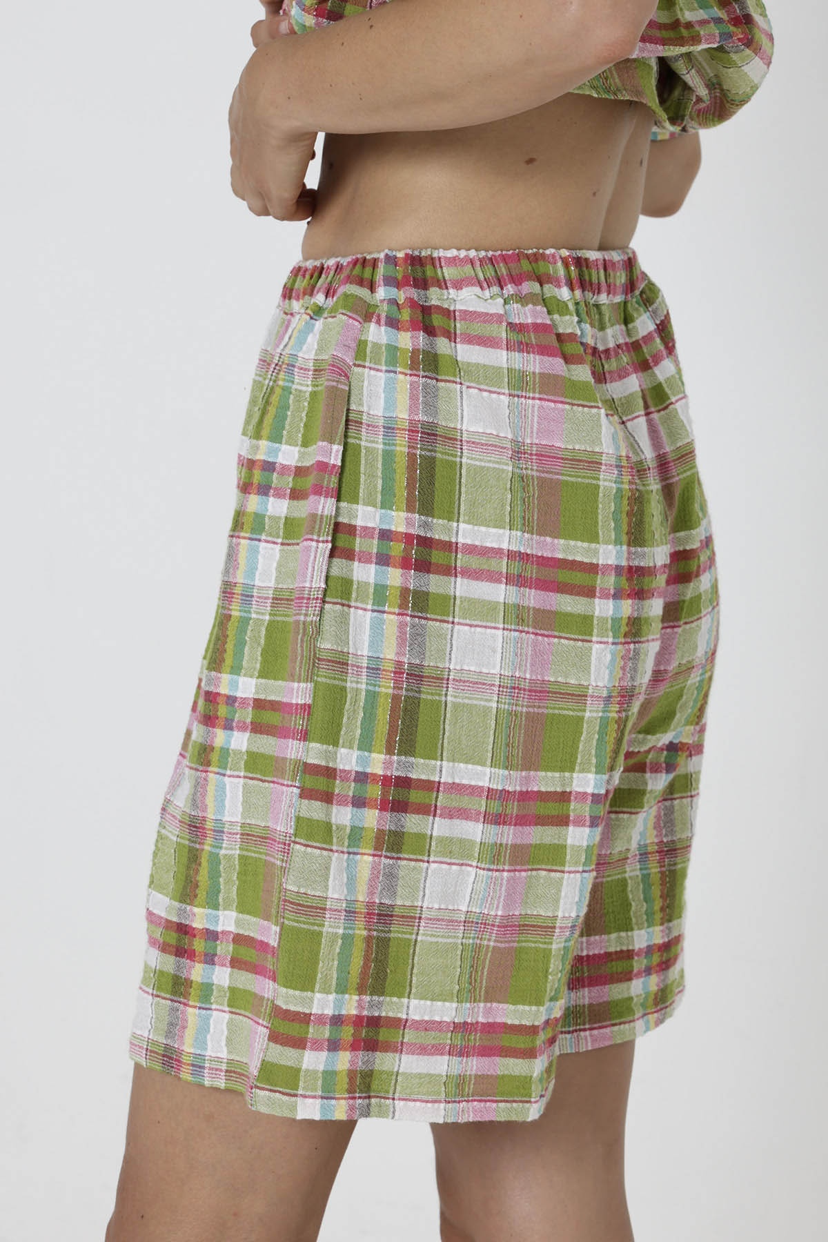 Le short Hedi est l'ajout parfait à votre garde-robe estivale. Confectionné en coton à rayures vert, blanc et rose avec un fil argenté, il combine style et confort pour toutes vos journées ensoleillées.