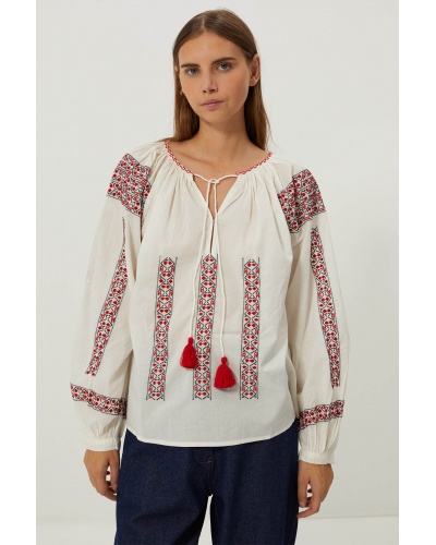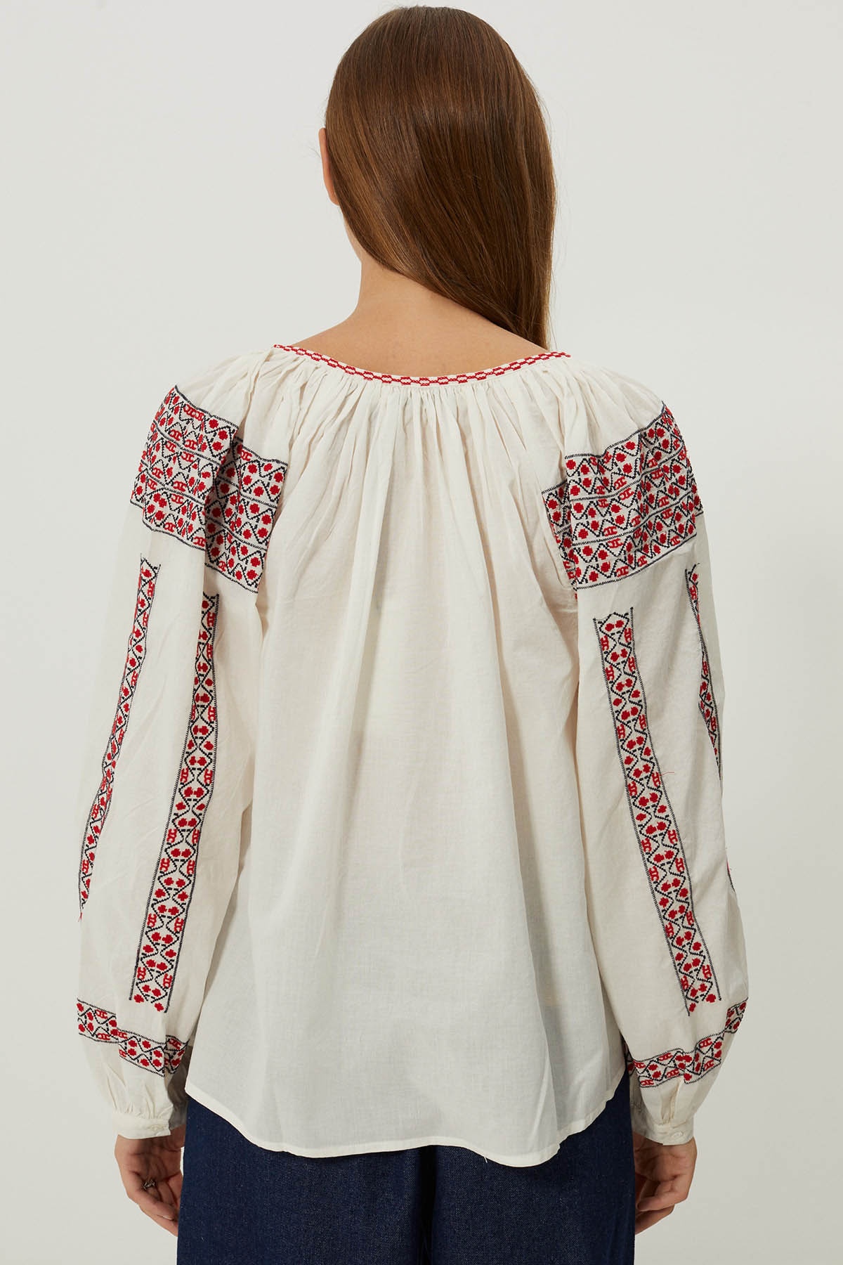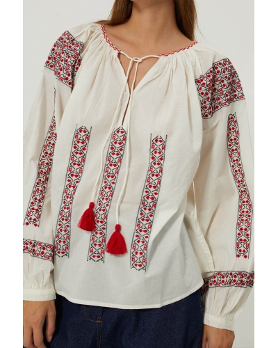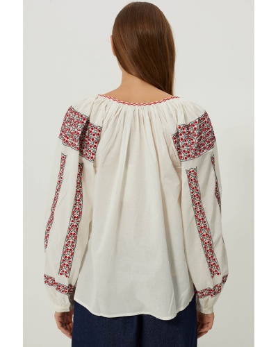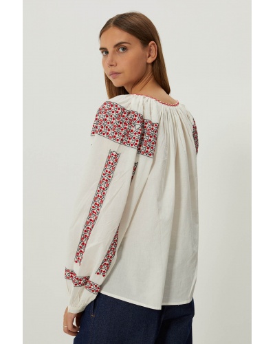 La blouse Elies se distingue par ses délicates broderies sur un coton blanc immaculé. Associez-la à votre pantalon en denim favori ou un pantalon en velours de la même couleur que ses broderies.