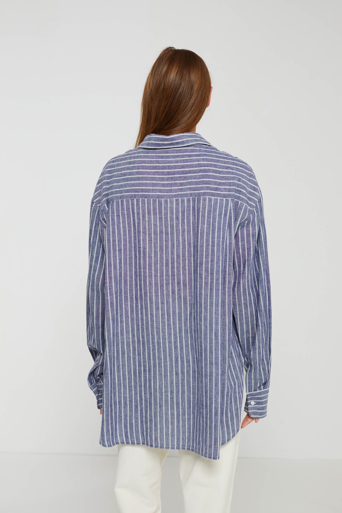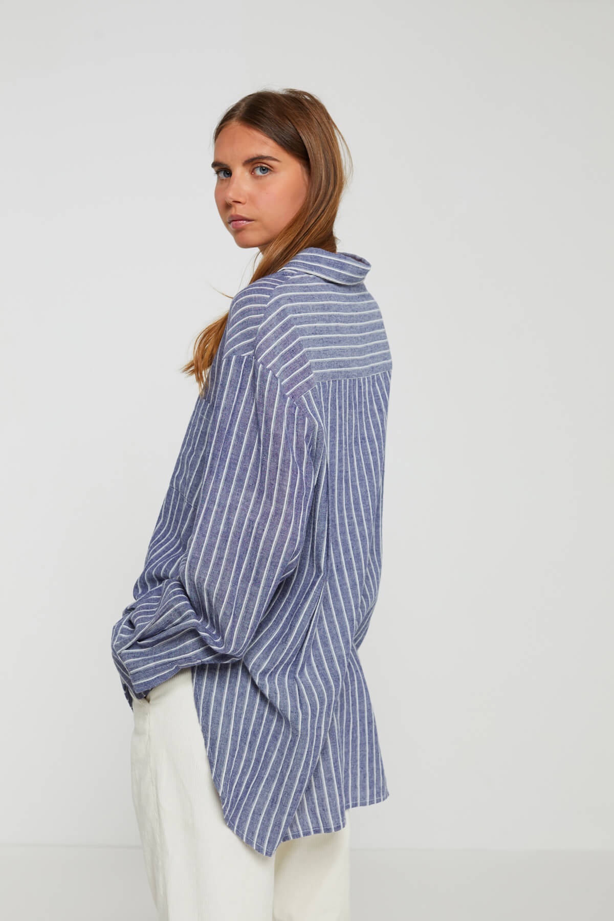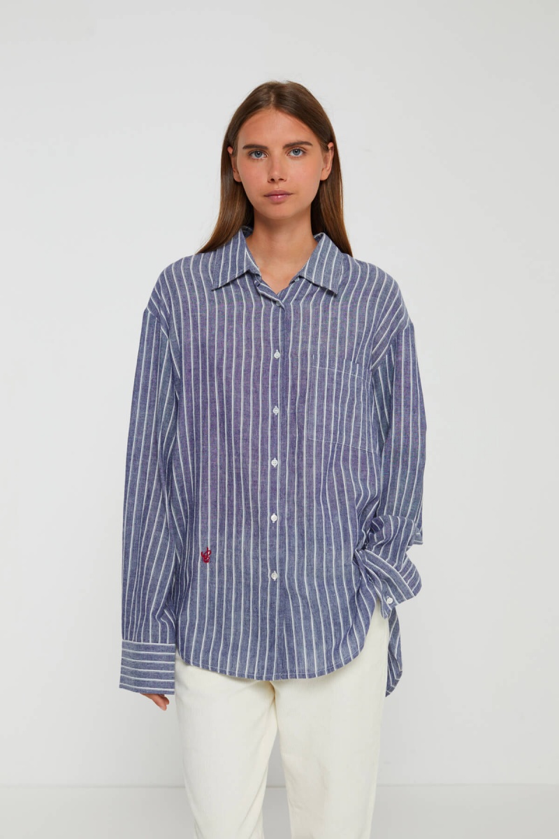 La chemise Elia est une pièce emblématique pleine d'élégance ; confectionnée dans un tissu à rayures de qualité, elle incarne le raffinement tout en ajoutant une touche distinctive grâce à ses détails uniques. En effet, les initiales CJ brodées avec soin sur le devant de la chemise, ajoutent une touche personnelle et exclusive à votre tenue.