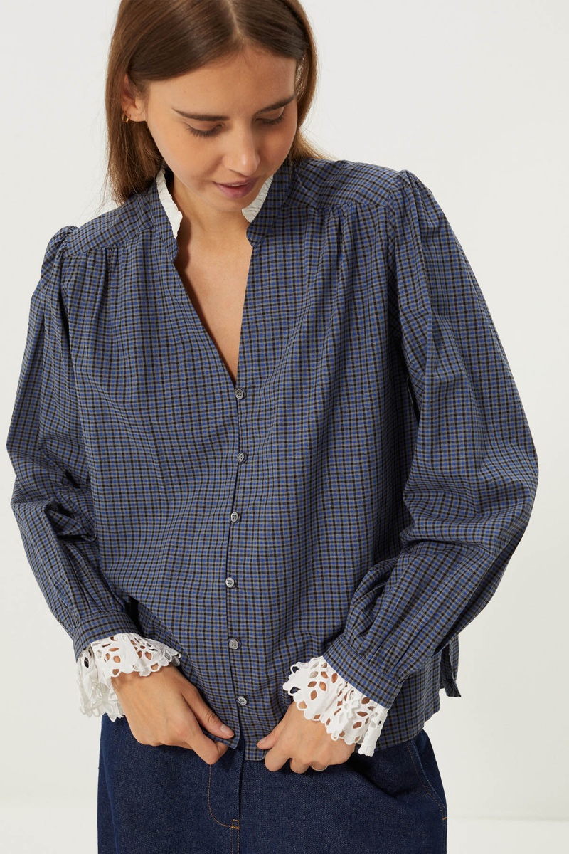 Chemise à carreaux en coton popeline à petit carreaux et dentelles