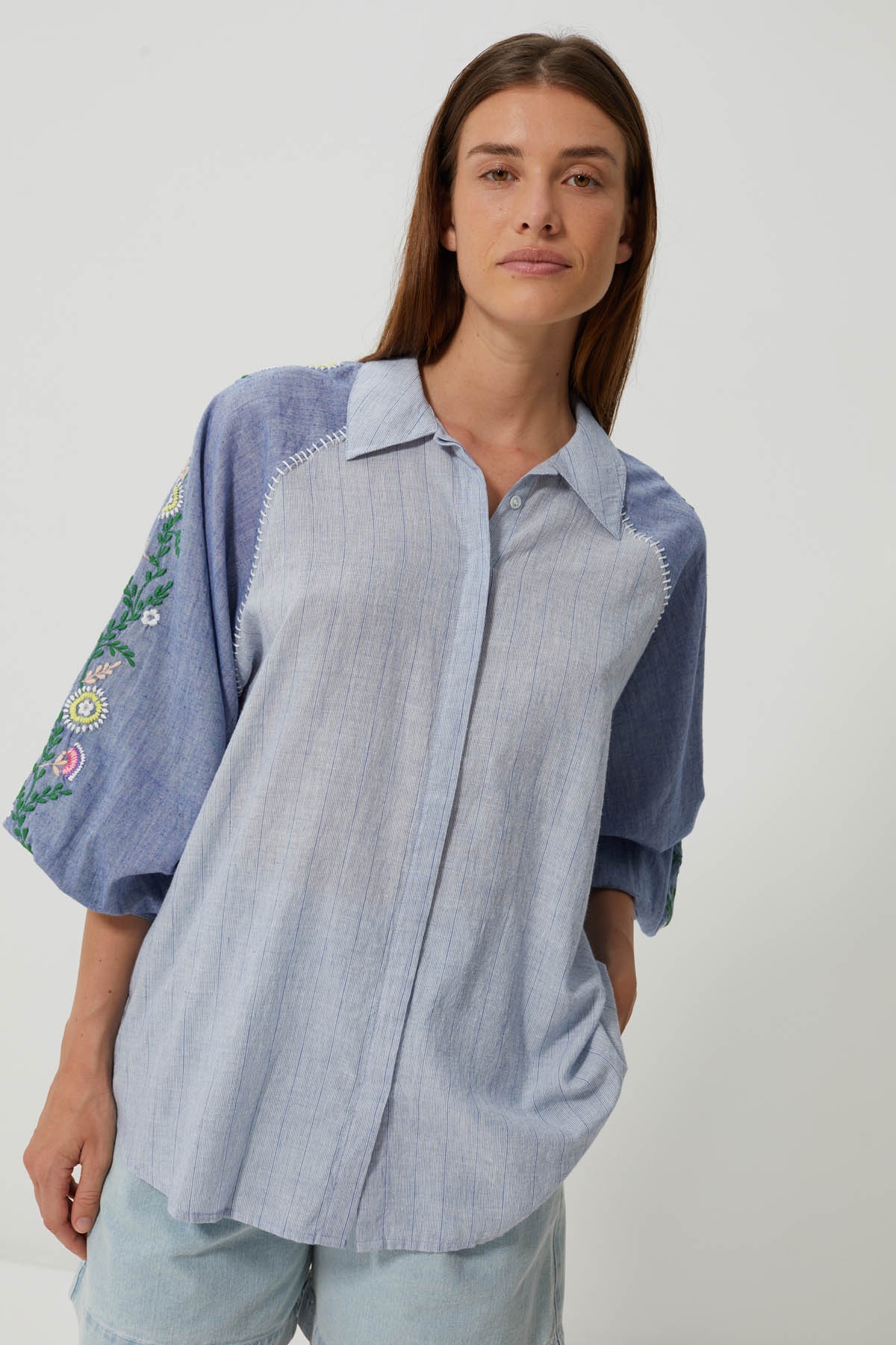 Son design ample et ses manches bouffantes unies lui confèrent une allure moderne et bohème, sublimée par de délicates broderies florales.