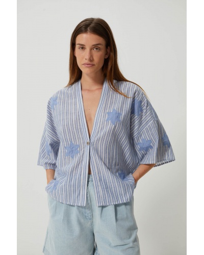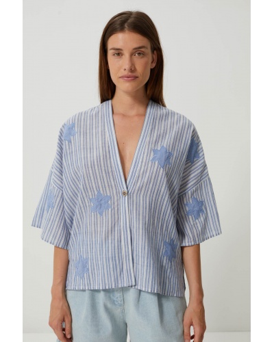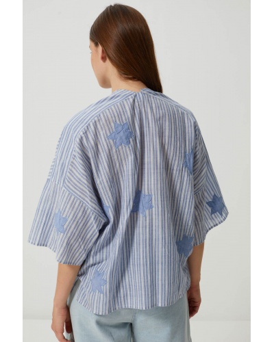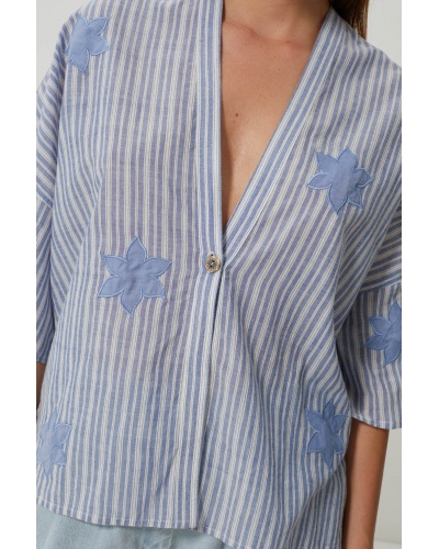 Son motif à rayures bleu, agrémenté de fleurs brodées, donne à cette chemise un côté bohème et raffiné, idéal pour un look estival tout en légèreté.
