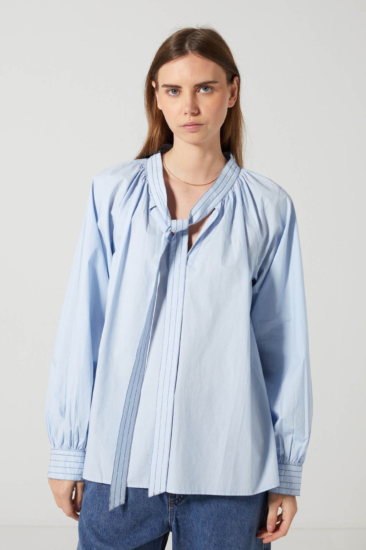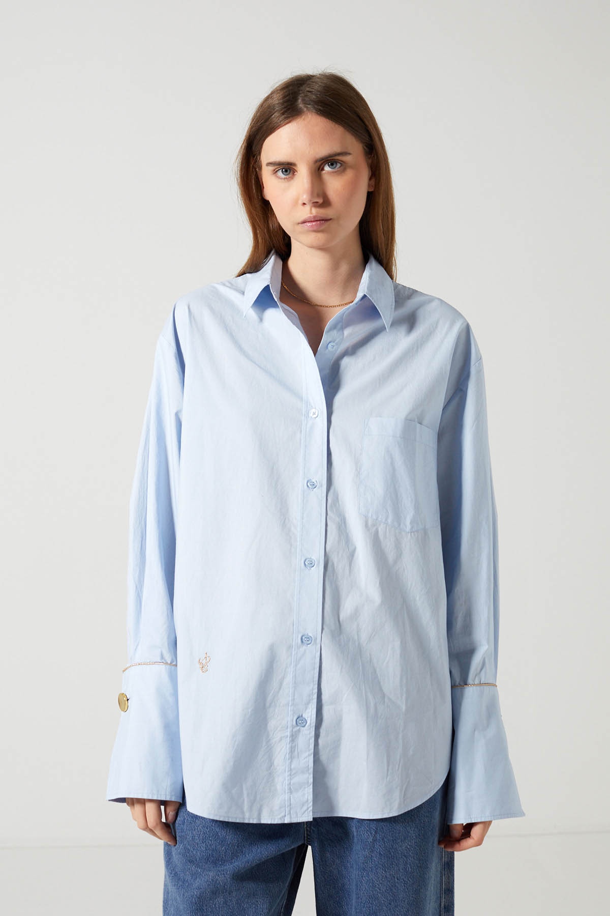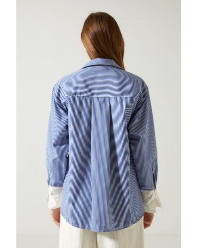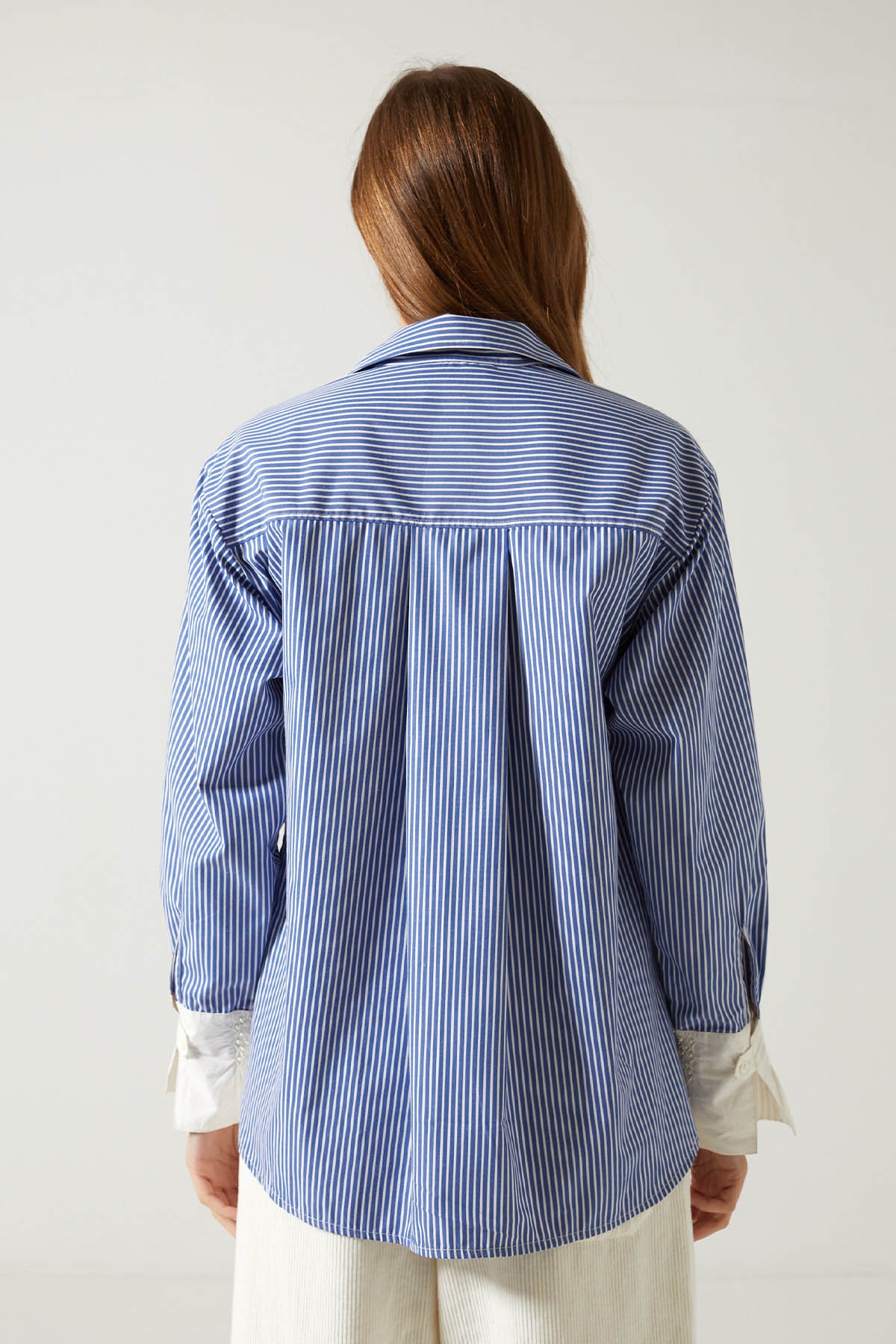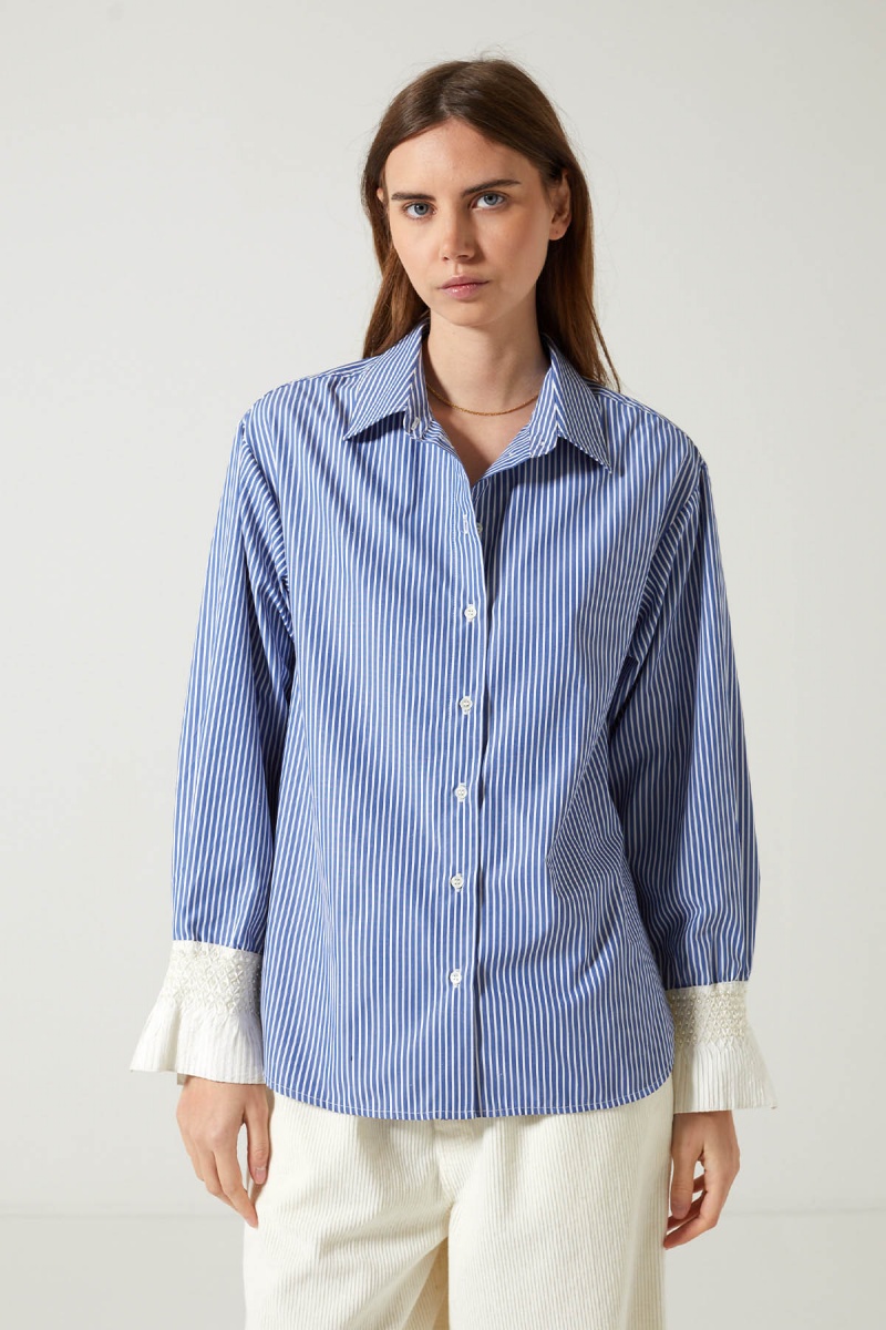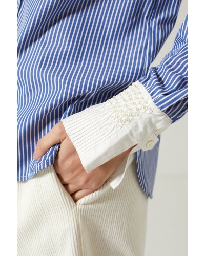 La chemise Avaline revisite un incontournable du vestiaire classique avec une touche féminine affirmée. Confectionnée dans un coton rayé bleu et blanc, elle se distingue par ses poignets smockés, dans un tissu contrastant façon popeline brodée agrémentée de perles.