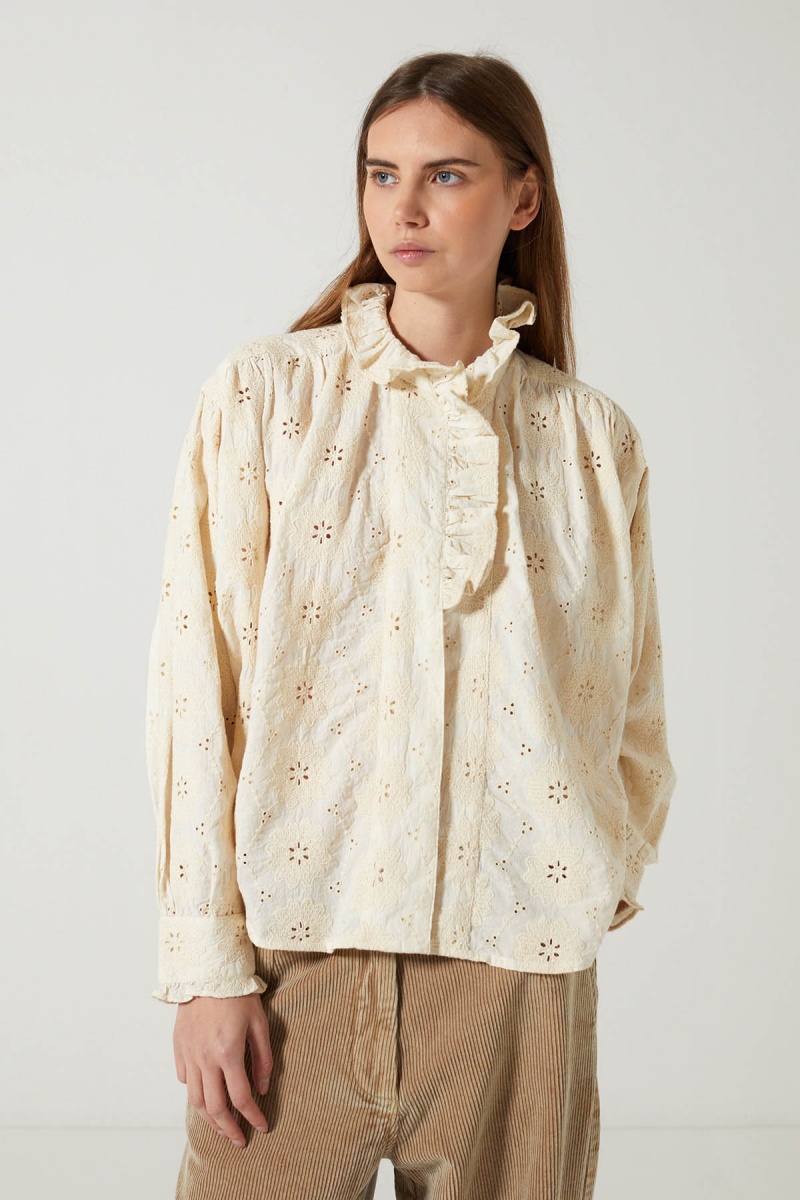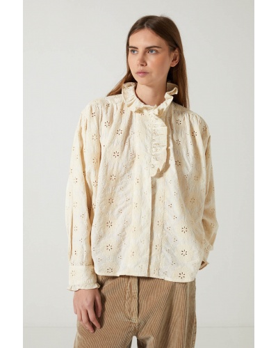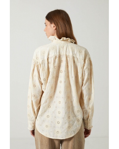 Inspirée du vestiaire romantique, la chemise Lise séduit par son charme intemporel. Confectionnée dans un tissu brodé délicat, elle dévoile un motif floral ajouré sur une base crème lumineuse. Le col volanté renforce son allure féminine et rétro.