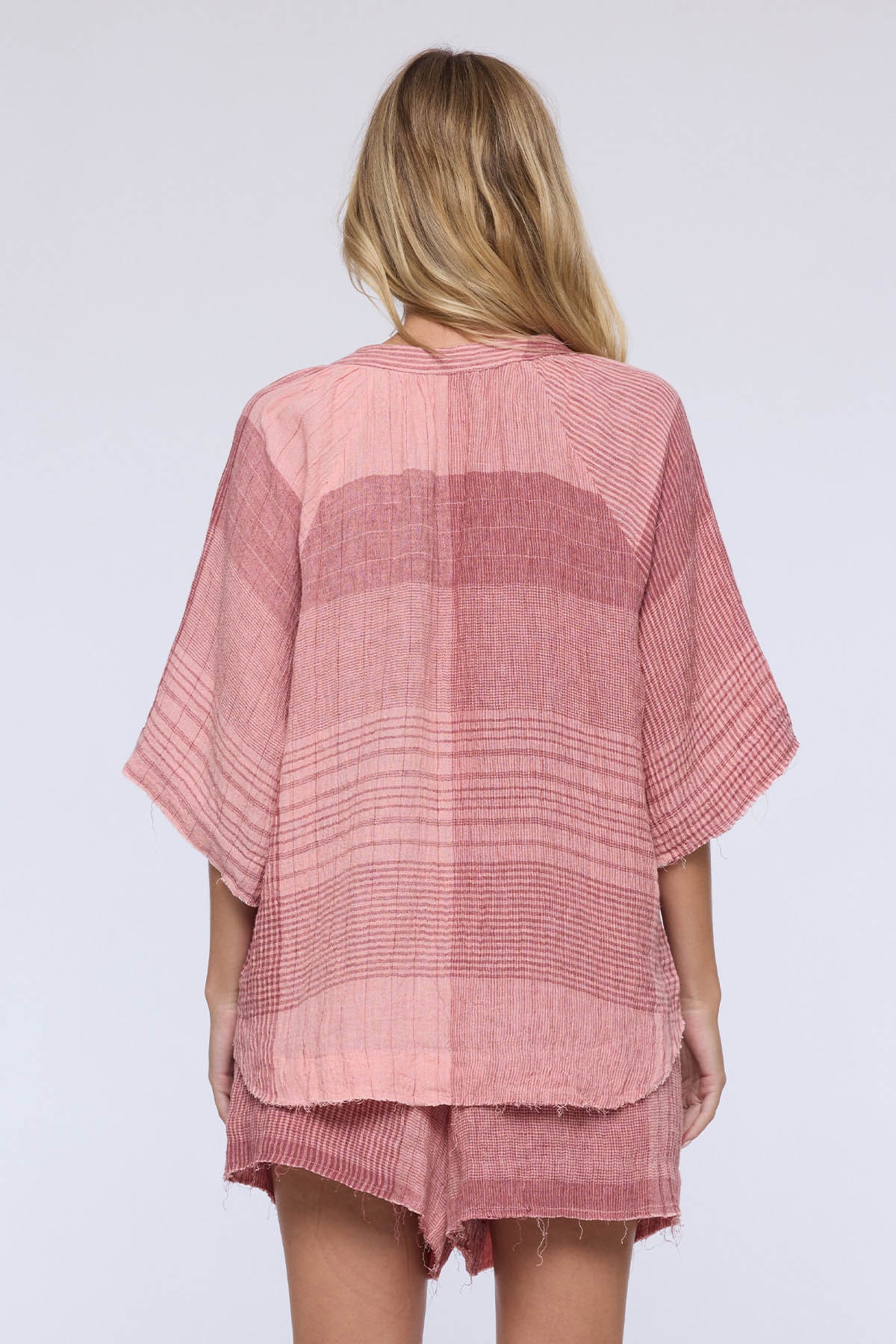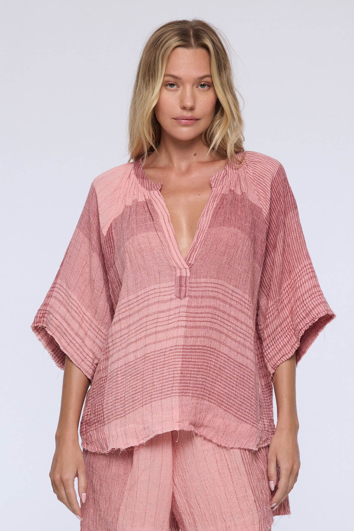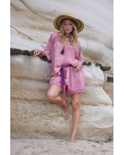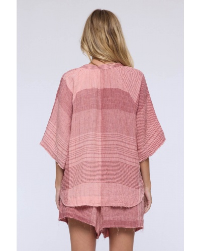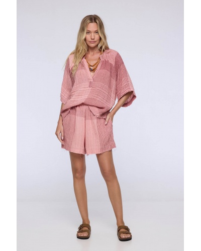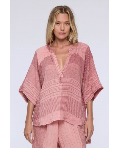 Le haut Bohe séduit par son tissu léger gaufré et sa coupe ample. Ses teintes roses et ses finitions brutes lui confèrent un look estival tendance, idéal pour un style décontracté mais raffiné.