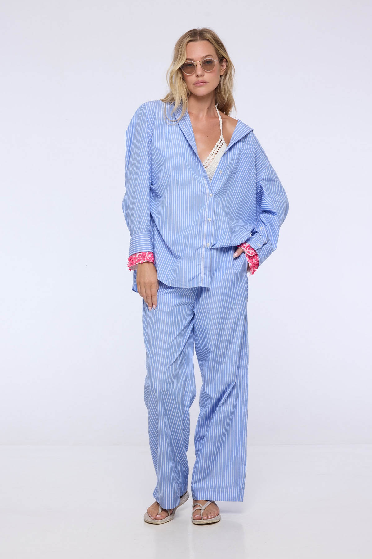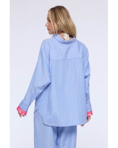 Elle se distingue par ses fines rayures bleues et ses doubles poignets, sertis de sequins fushia, qui apportent du rythme et de l'originalité à la silhouette. Longue et oversize portez la avec son pantalon assortis pour total look unique et tendance.