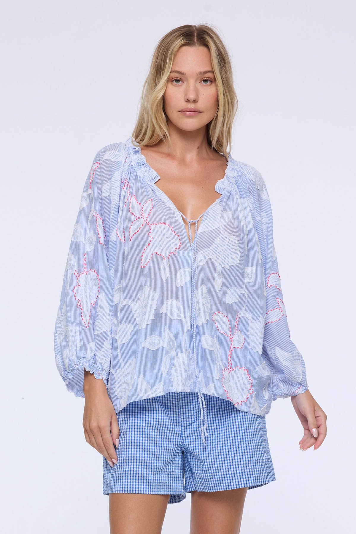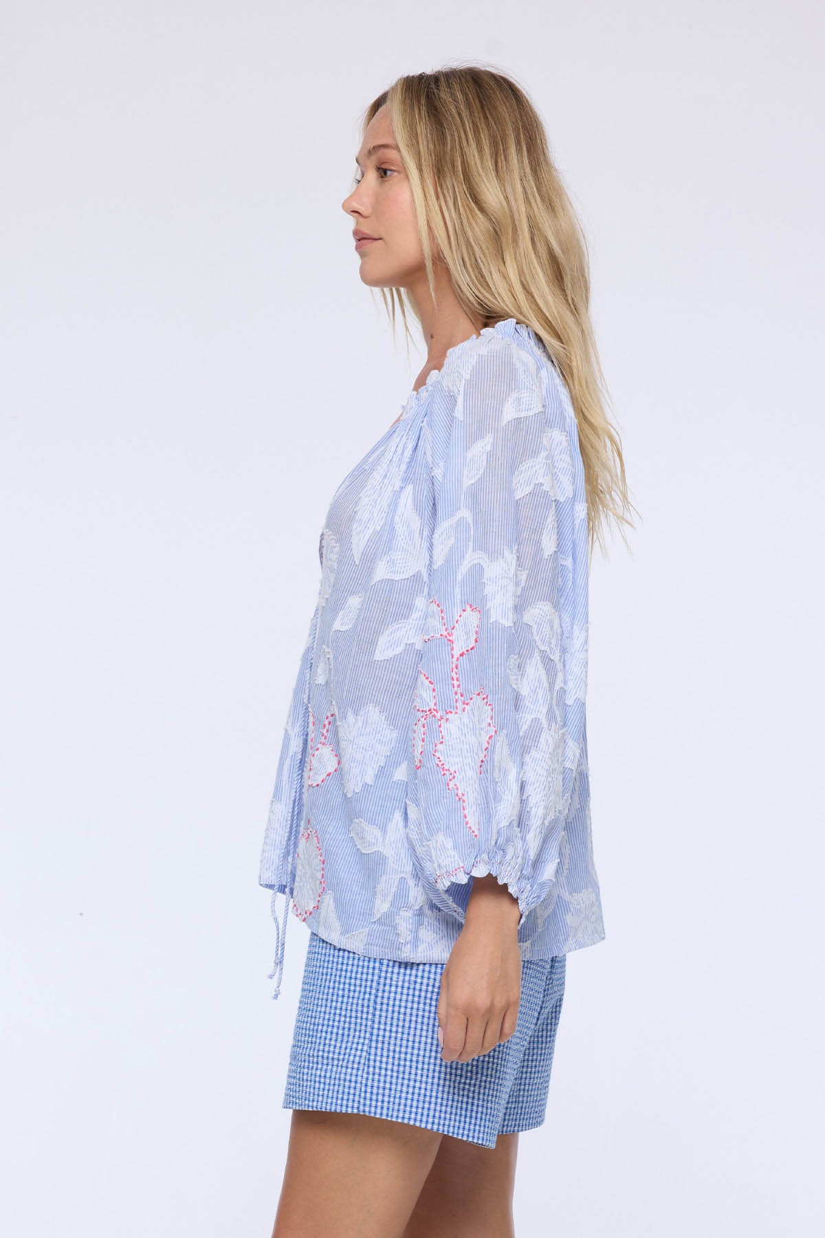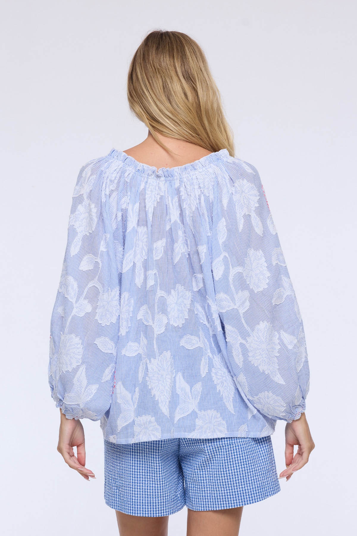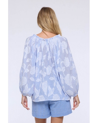 Son encolure froncée, dotée de liens à nouer, ajoute une touche féminine et personnalisable, tandis que ses manches bouffantes élastiquées apportent volume et douceur.