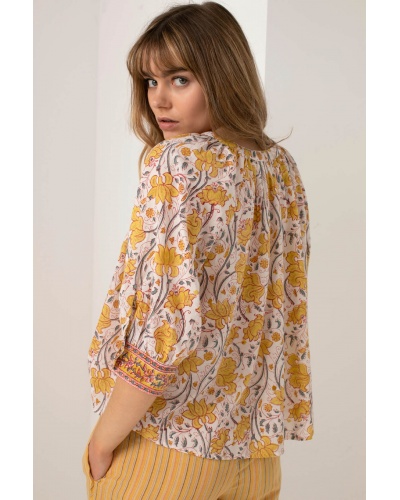 Blouse en coton brodée . Coupe ample . Manches longues . Col montant smocké . Fermeture boutonnée avec patte de boutonnage cachée ....