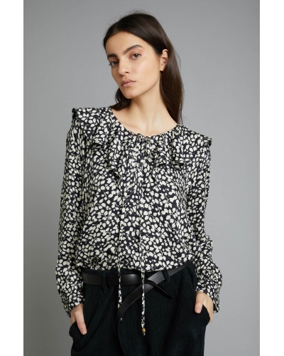 La blouse Ruffle séduit par son imprimé floral noir et blanc intemporel et son allure romantique.
