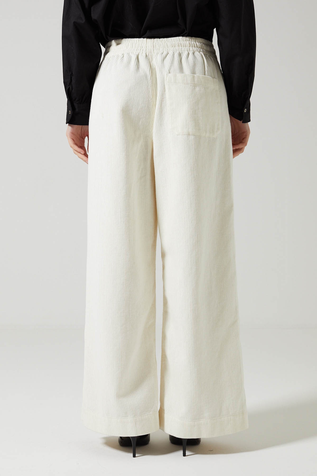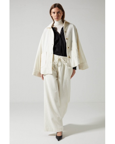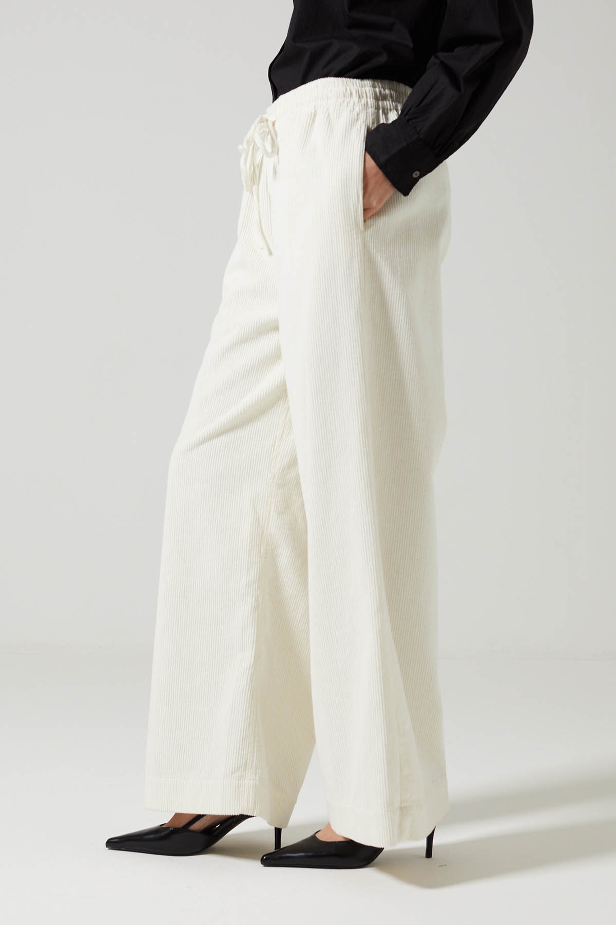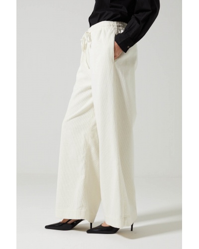 Le pantalon Loula allie confort et élégance avec sa coupe ample en velours côtelé écru. Sa taille élastiquée avec lien de serrage lui confère une allure décontractée, idéale pour vos journées cocooning comme pour des looks plus sophistiqués.