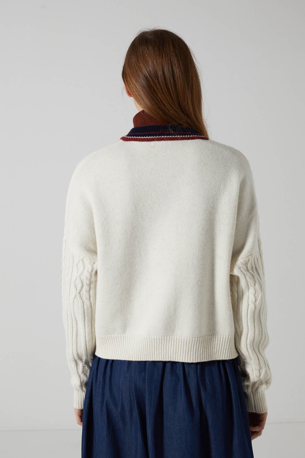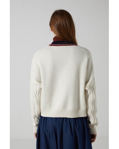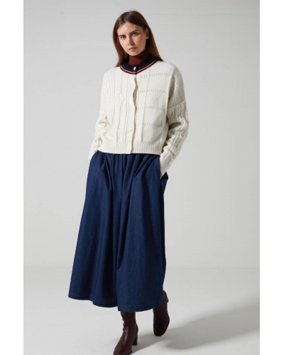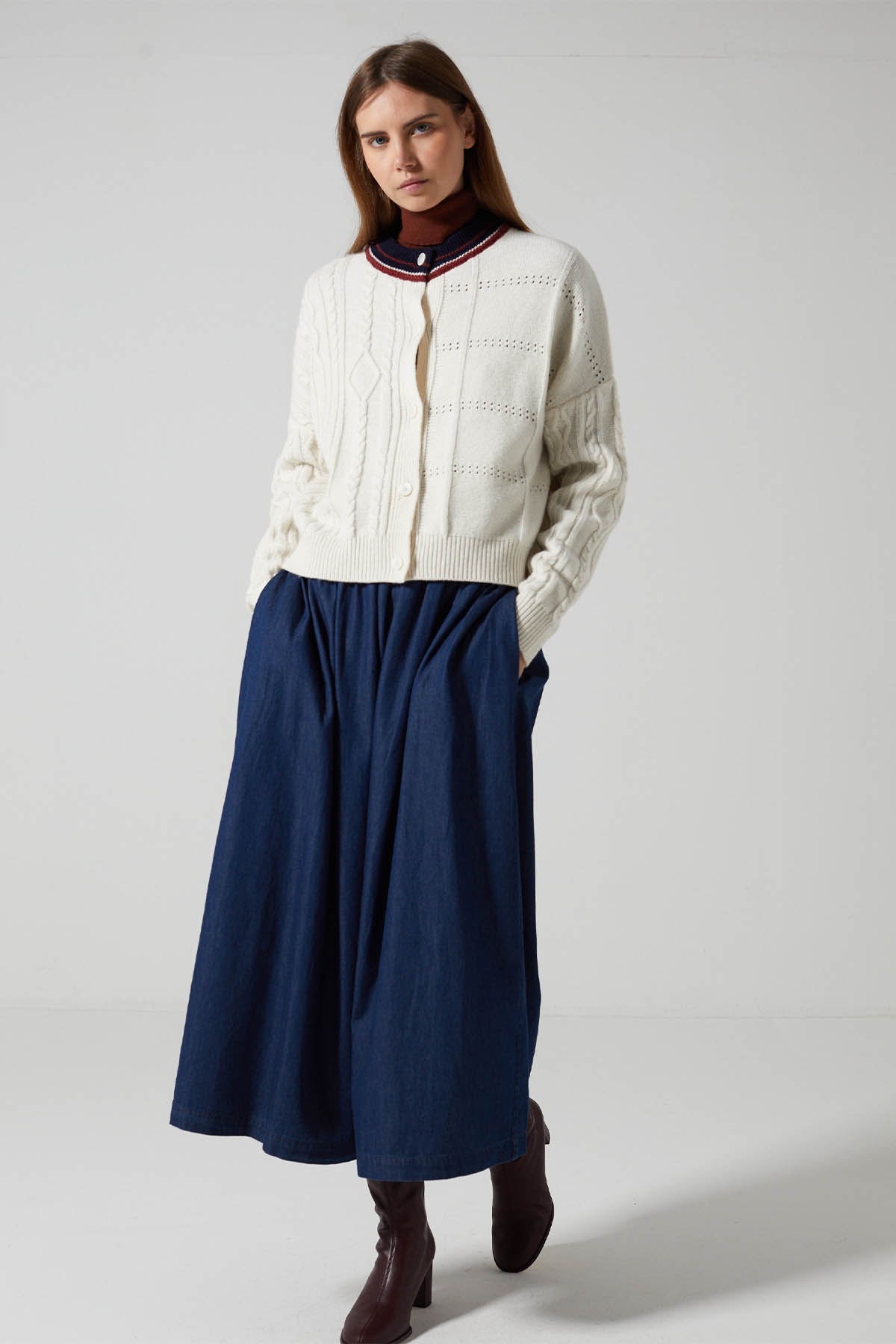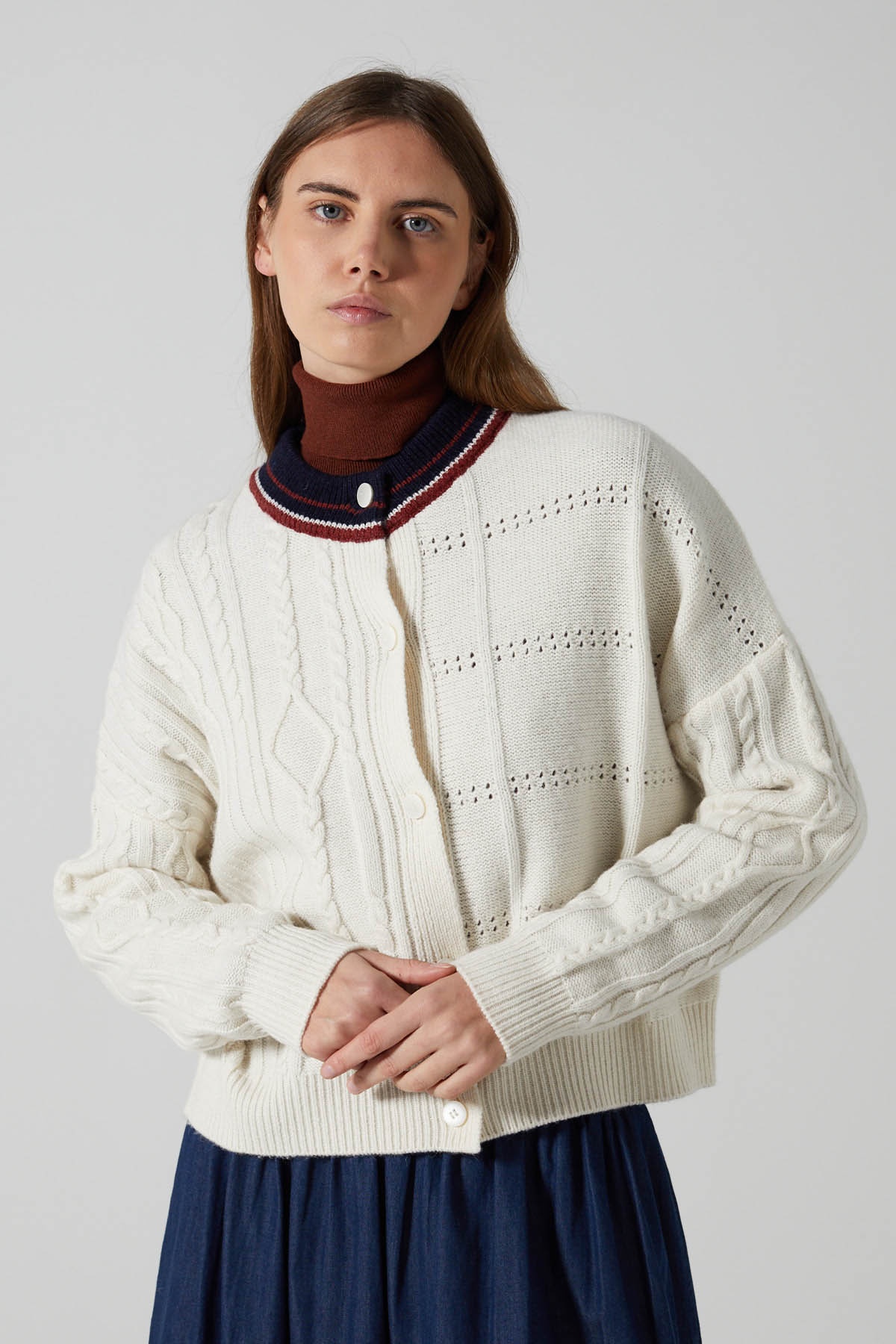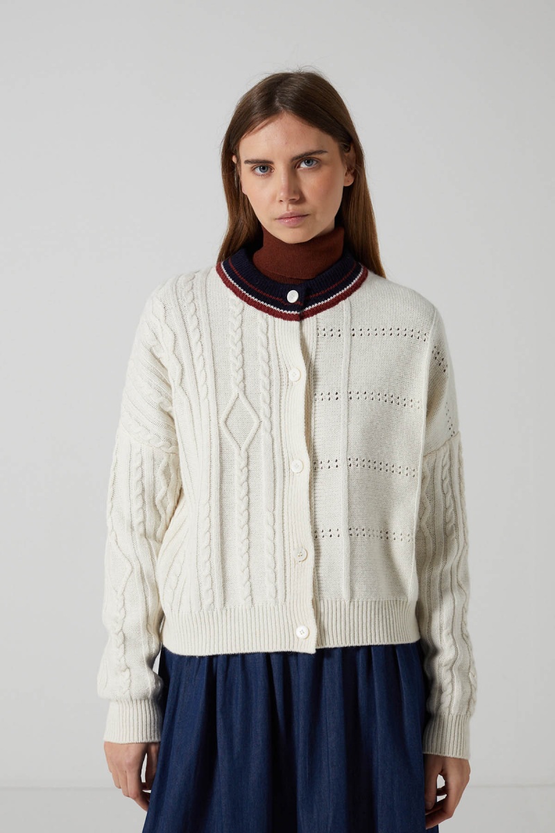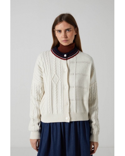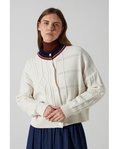 Le cardigan Olga incarne l’élégance cosy avec sa maille richement travaillée de torsades et de points ajourés. Sa coupe droite et légèrement raccourcie lui confère un style moderne, tandis que son col rond contrasté par des rayures bordeaux et bleu marine apporte une note sport-chic inattendue.