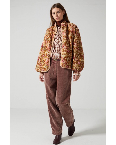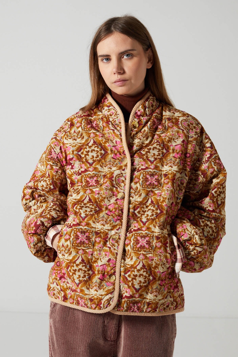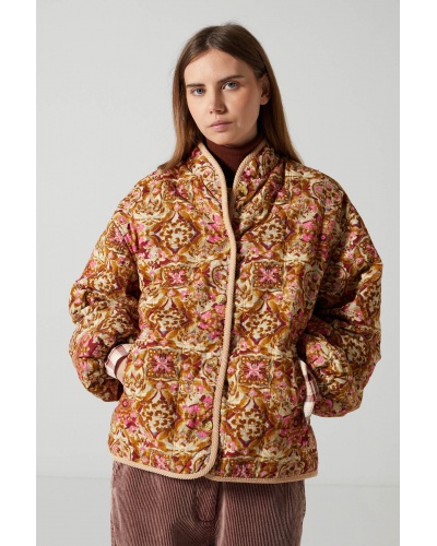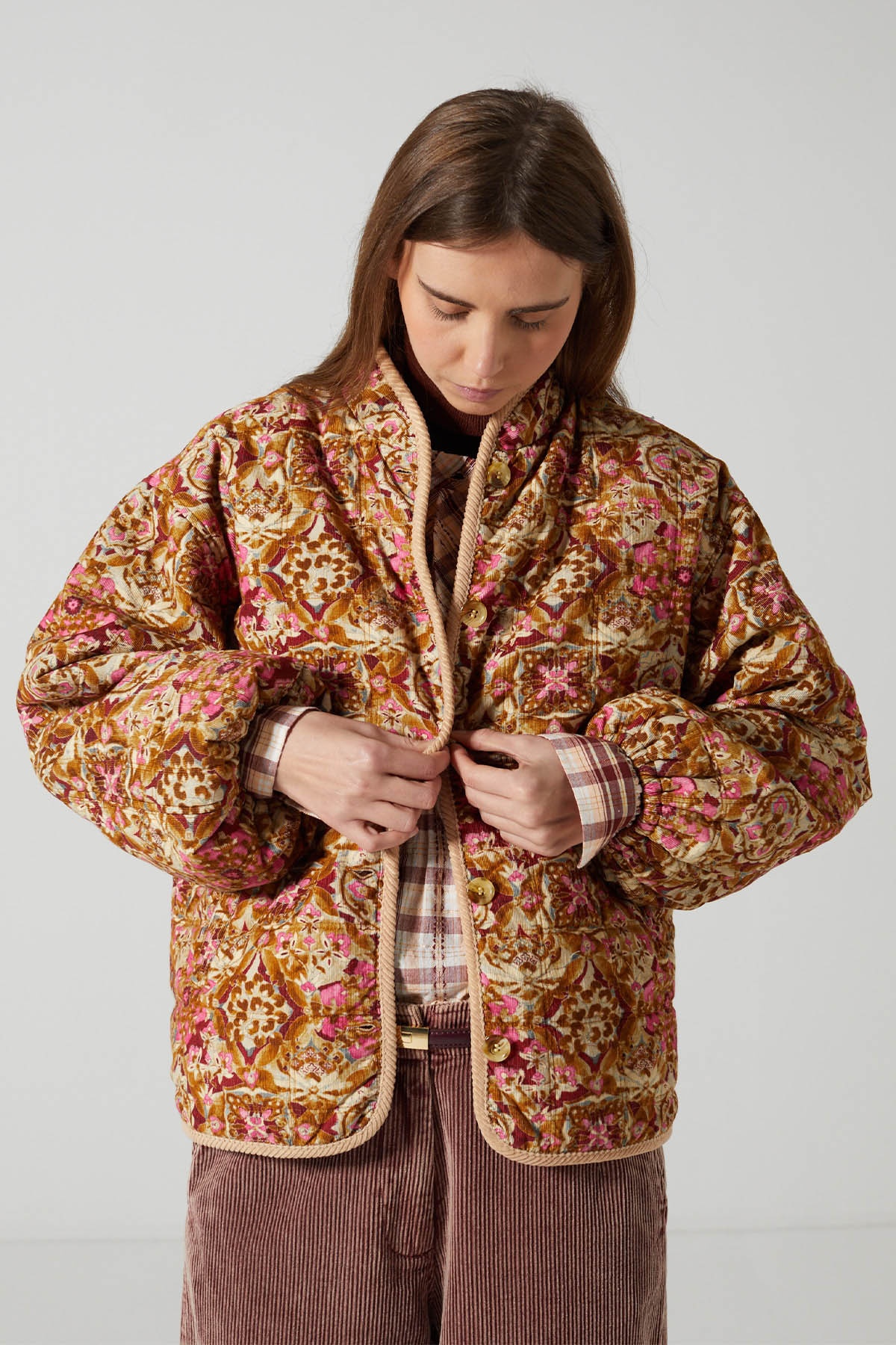 Découvrez la veste Priya et son matelassage confortable, sublimé par un imprimé riche en nuances, mêlant des tons terre et des touches de rose pour un effet vibrant et raffiné. Sa coupe légèrement oversize, fermée par des boutons, lui confère un charme artisanal unique.