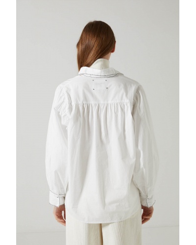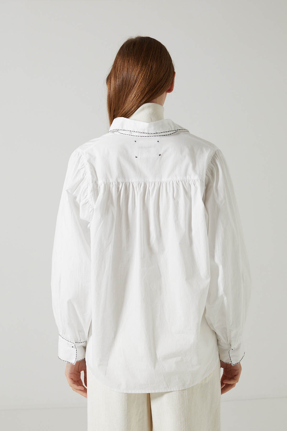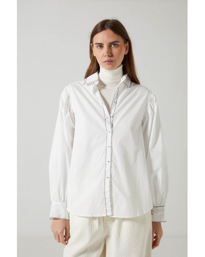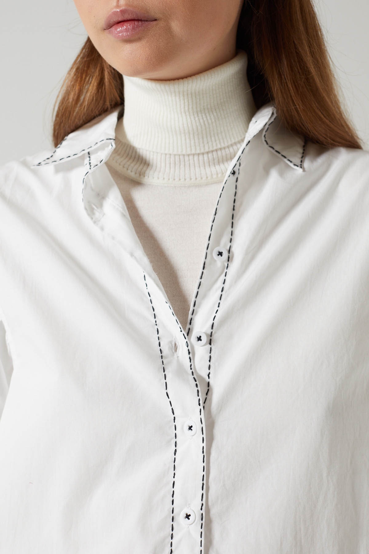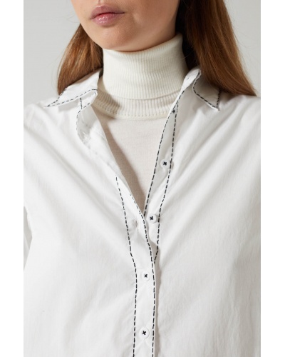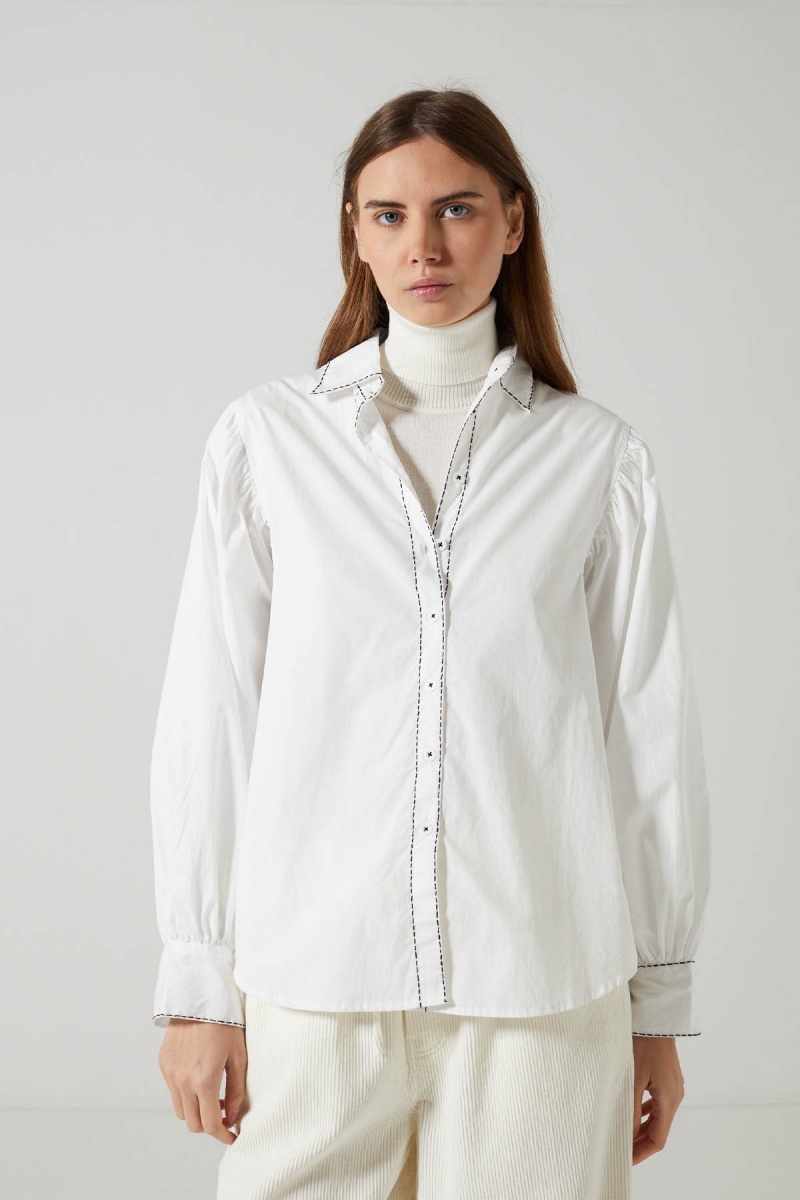La chemise Tenji se distingue par sa ligne épurée relevée de délicates surpiqûres contrastées qui soulignent les bords du col, la patte de boutonnage et les poignets.