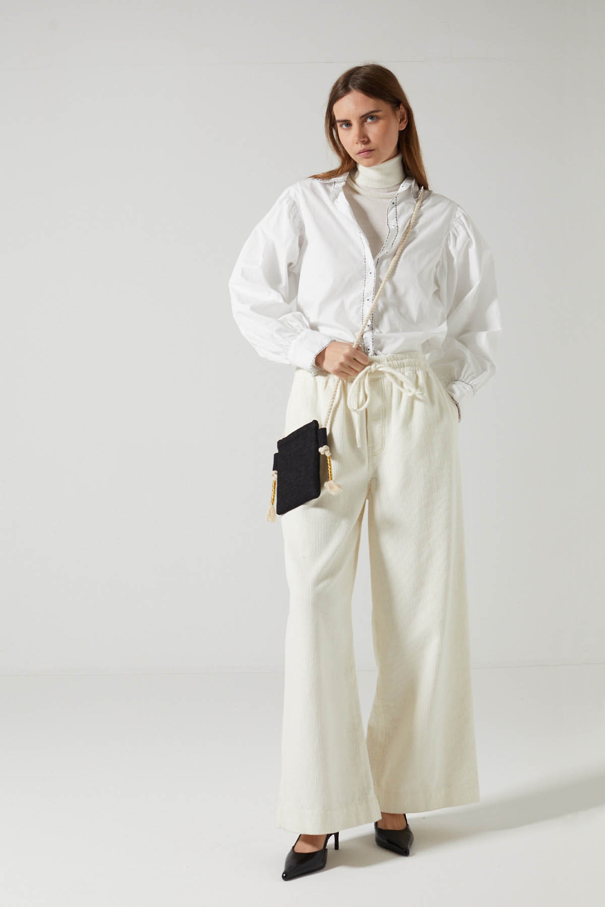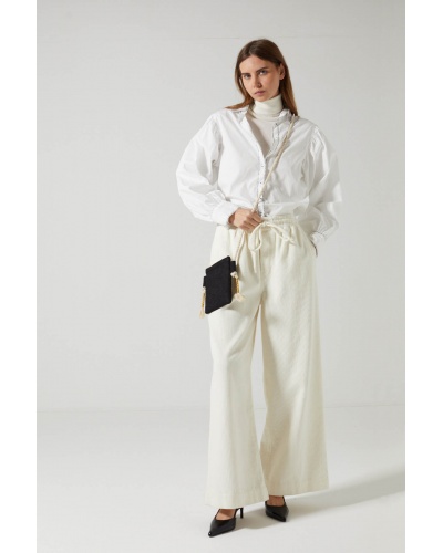 Sa coupe fluide et légèrement ample apporte confort et aisance au quotidien, tandis que les manches longues et froncées ajoutent une subtile touche de volume.