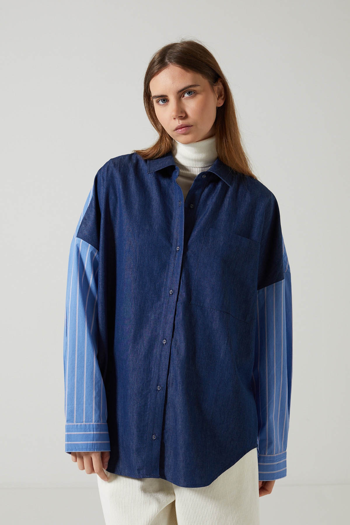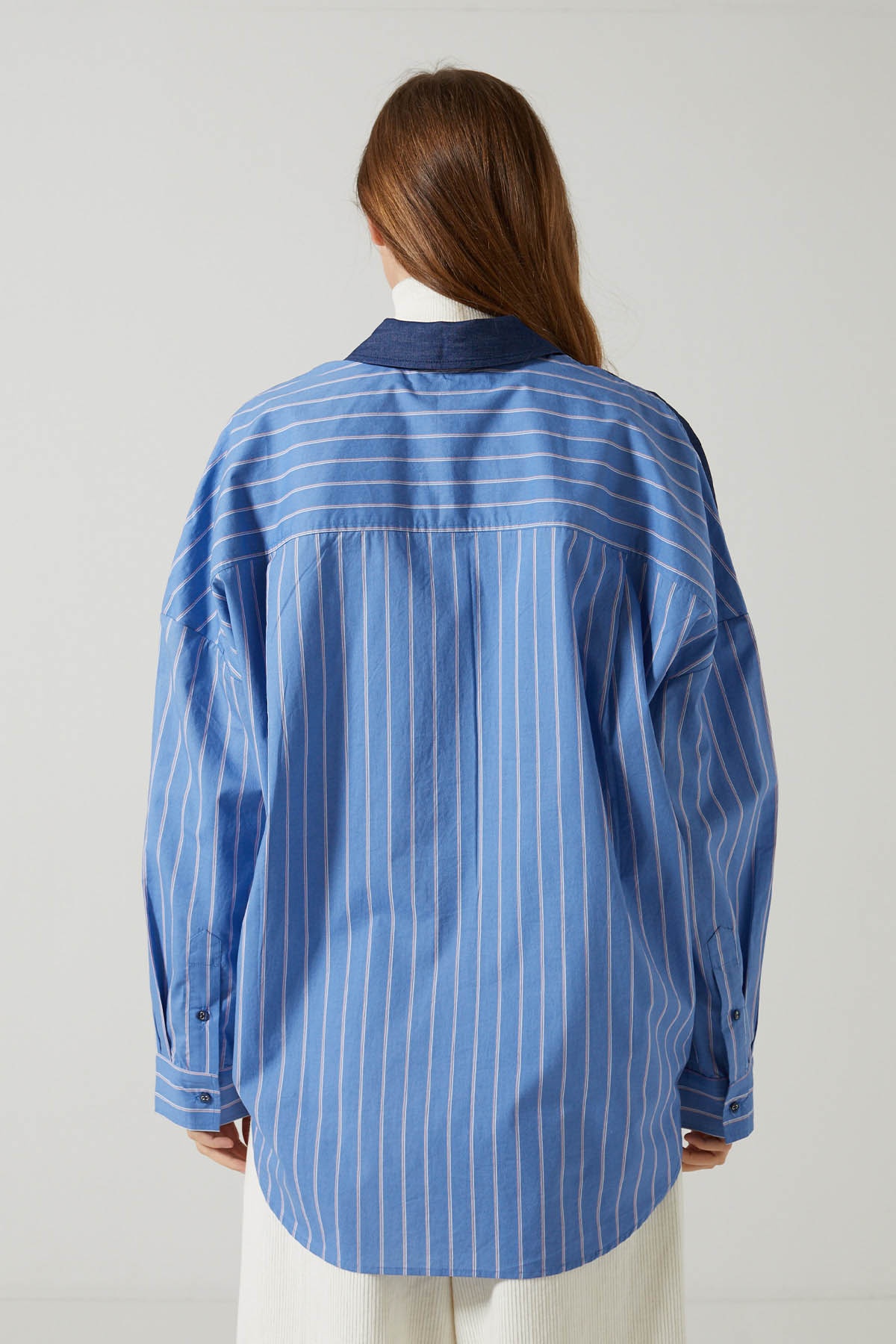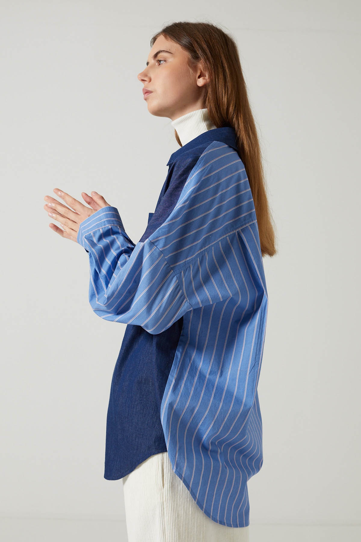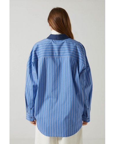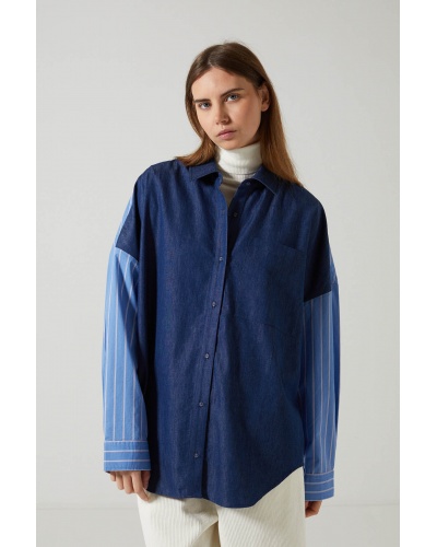 La chemise Simona joue sur les contrastes et les associations inattendues pour un look moderne et original. Sa coupe oversize apporte une allure décontractée, tandis que son design bicolore : denim uni à l’avant et manches rayées en coton bleu clair, lui confère un style contemporain.