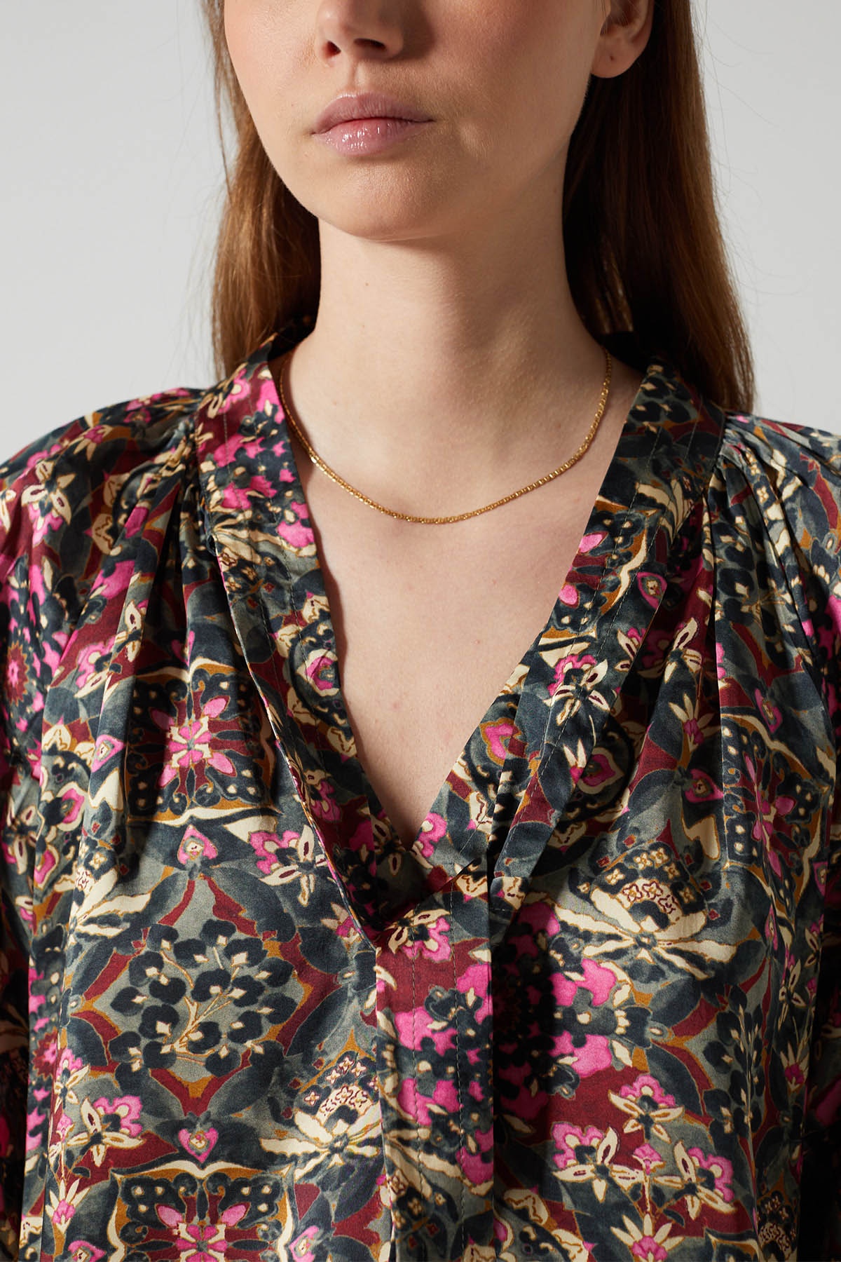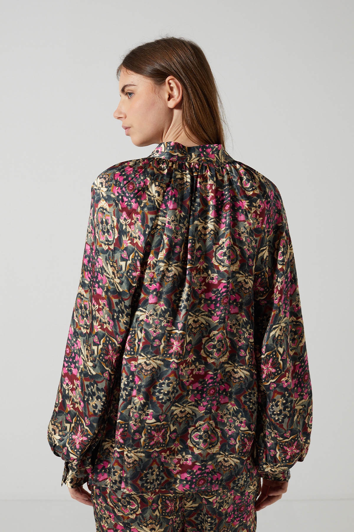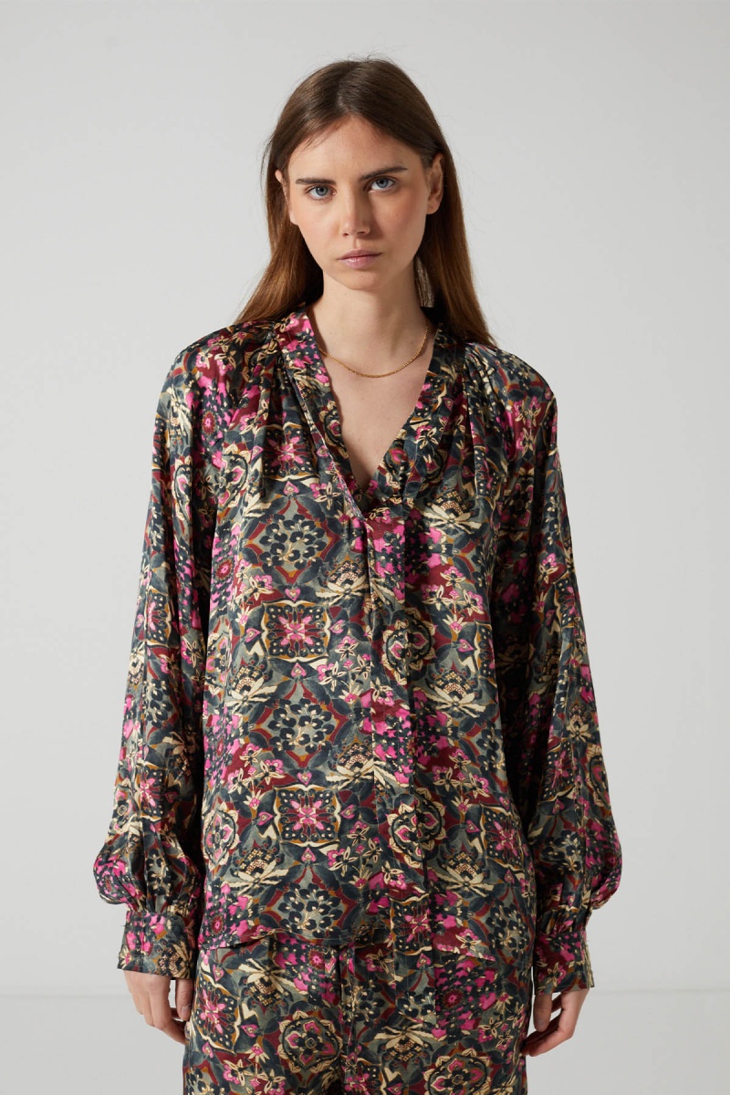 La blouse Zeline séduit par son allure fluide et sophistiquée, sublimée par un imprimé riche mêlant nuances profondes de rose, vert et doré. Confectionnée dans une matière satinée qui capte délicatement la lumière, elle offre une silhouette élégante et confortable avec son col en V qui se poursuit à l'aide d'un lien à nouer.