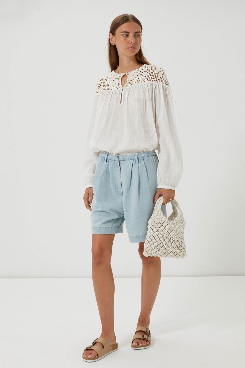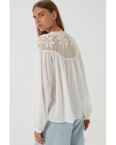 La blouse Dilraba allie élégance et légèreté avec son tissu aérien et son empiècement en crochet délicatement ajouré. La coupe ample de cette dernière et ses manches légèrement bouffantes apportent du volume et un confort absolu.