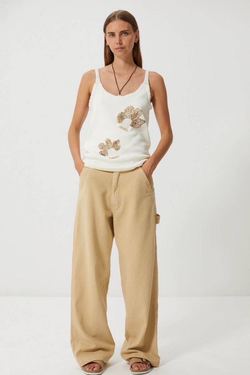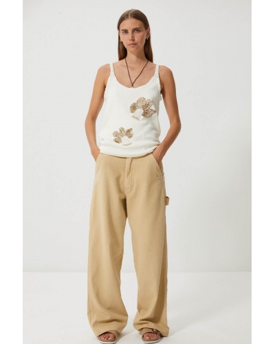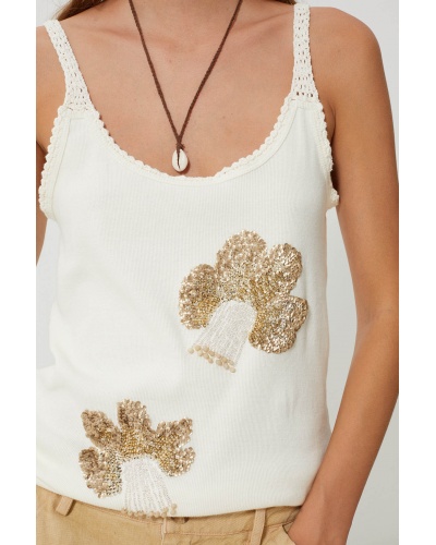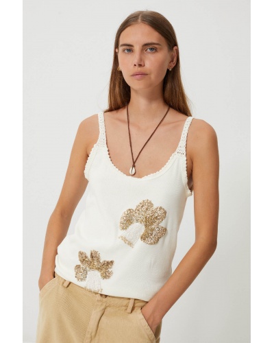Confectionné dans une maille douce et légère, il séduit par ses bretelles en crochet délicatement travaillées et ses broderies florales en sequins dorés qui apportent une touche lumineuse et sophistiquée.