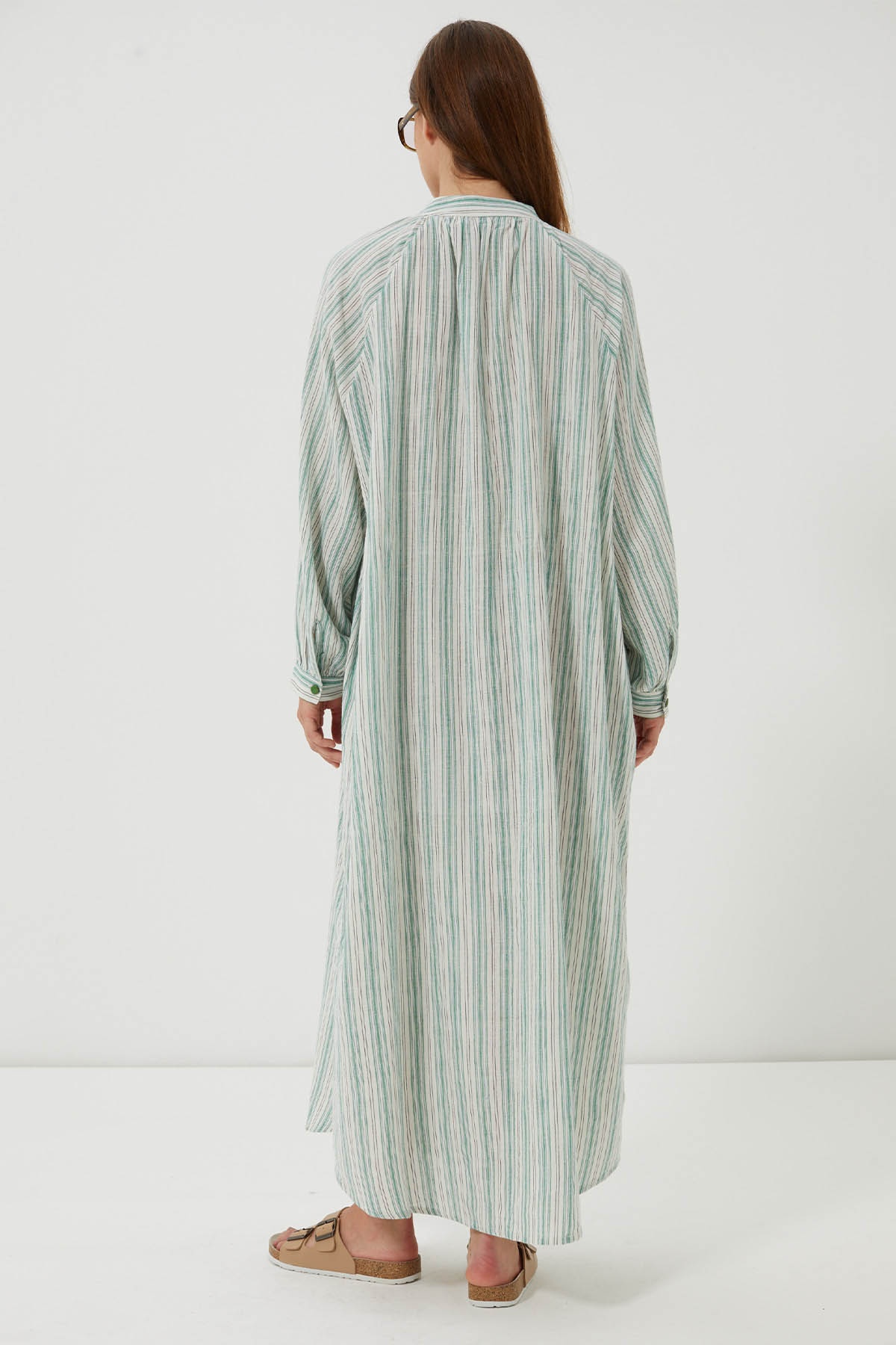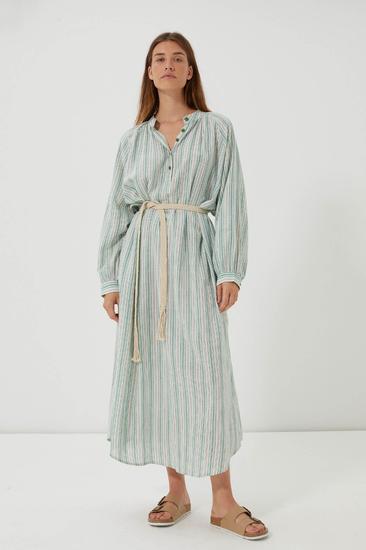 Laissez-vous séduire par l’élégance décontractée de la robe Kauny. Confectionnée dans un tissu léger à rayures subtiles, cette robe longue fluide est idéale pour les journées ensoleillées.