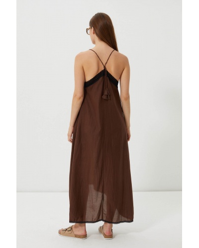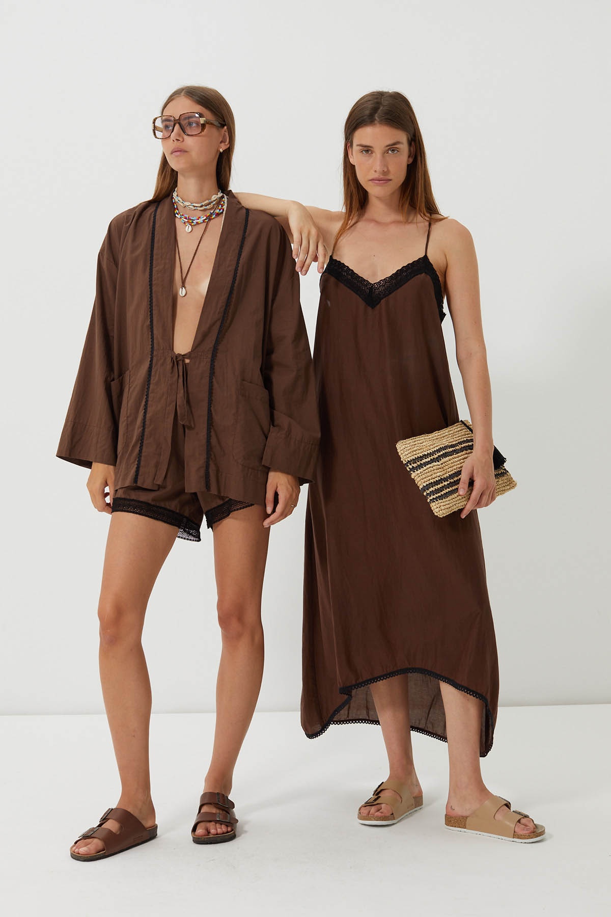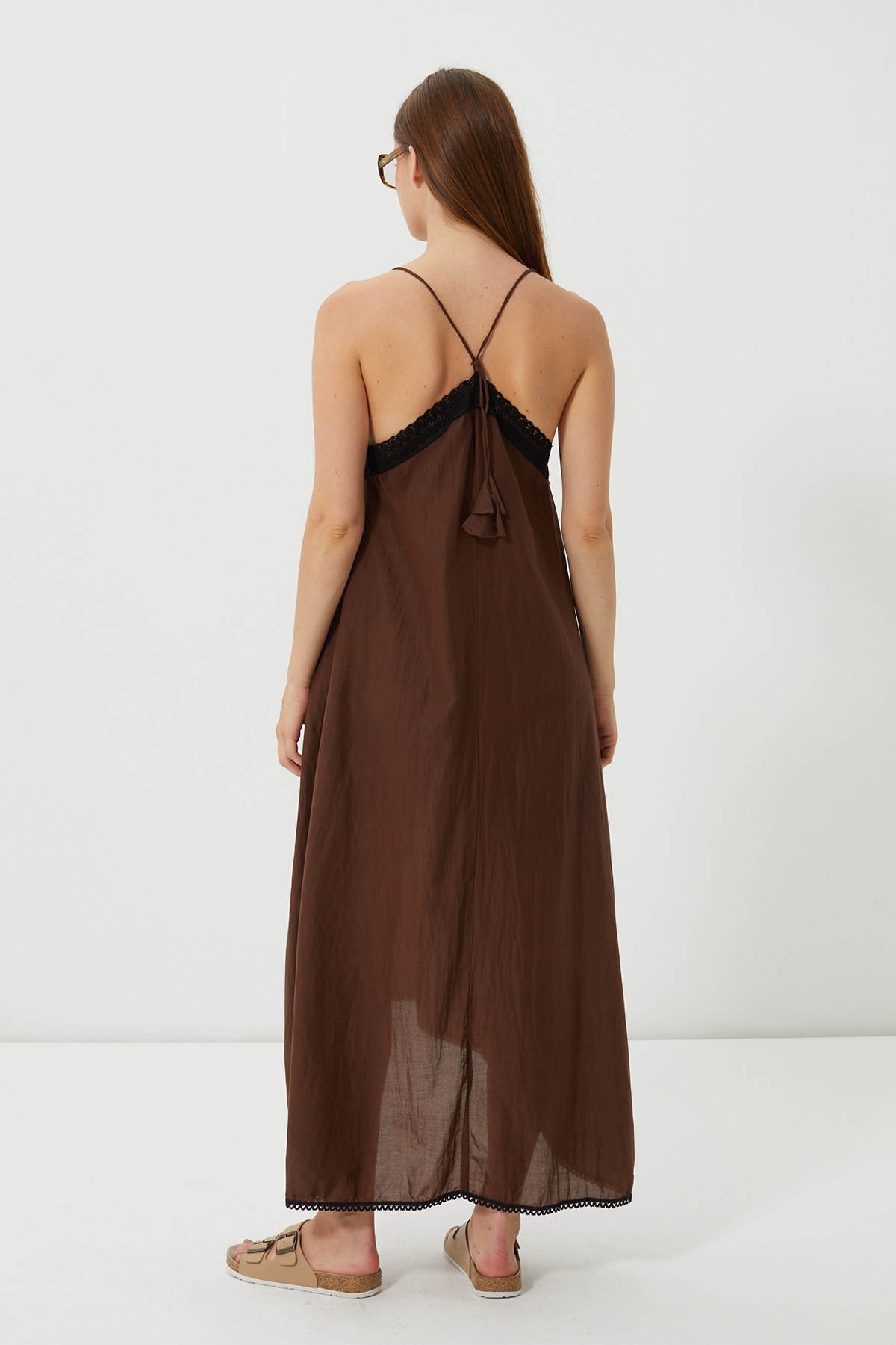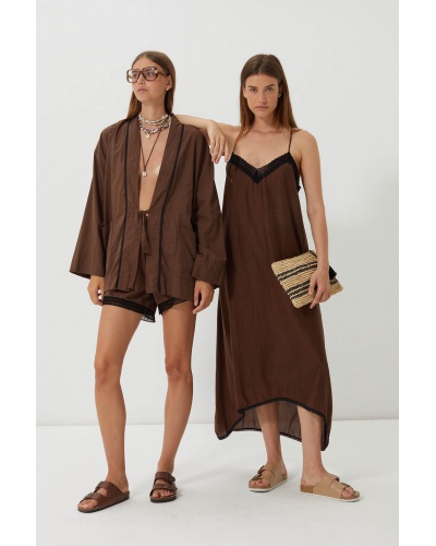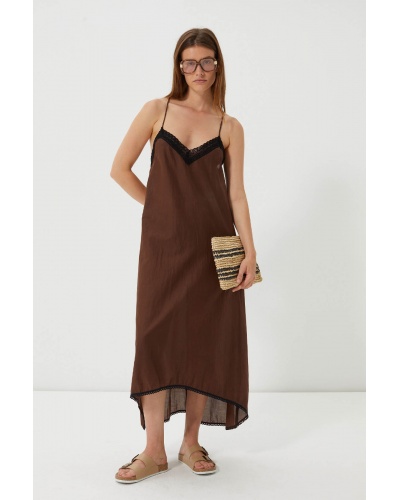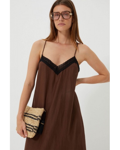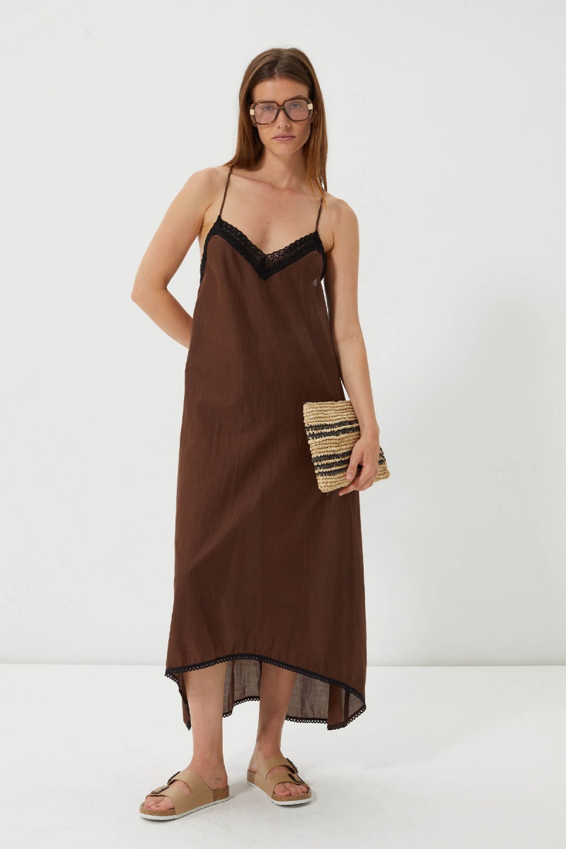 Adoptez l’élégance effortless avec la robe 1999, une robe longue à bretelles fines confectionnée dans une matière légère et fluide. Sa coupe droite et son tissu chocolat sont rehaussés de détails en dentelle noire, pour une allure féminine et raffinée.