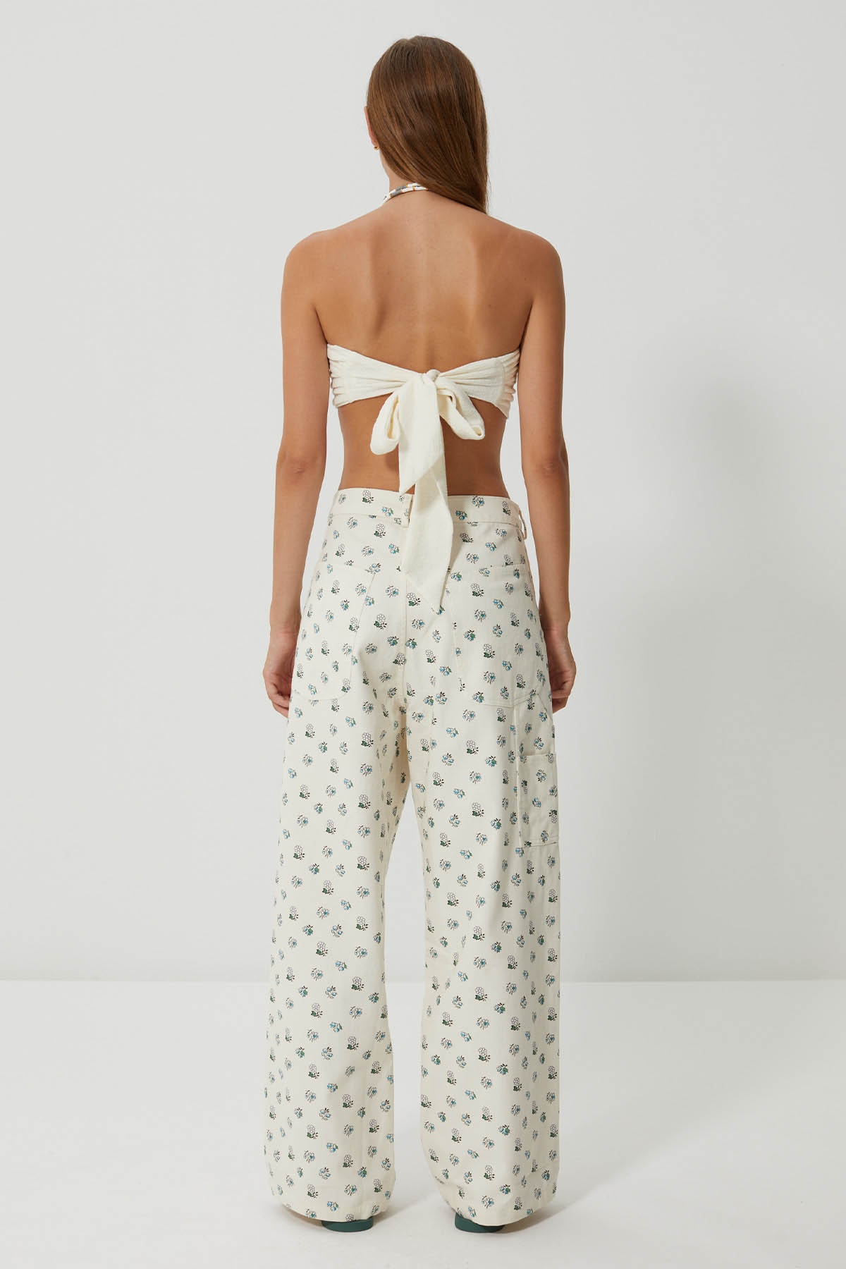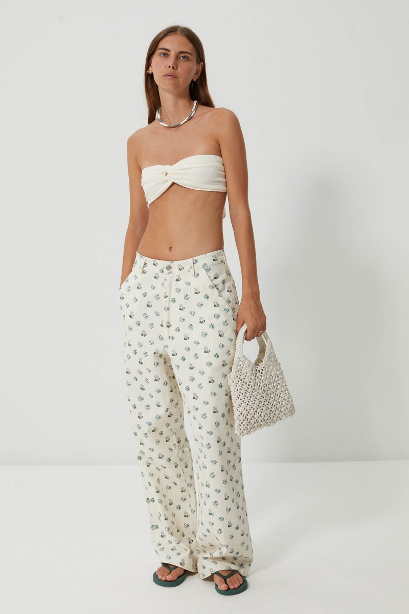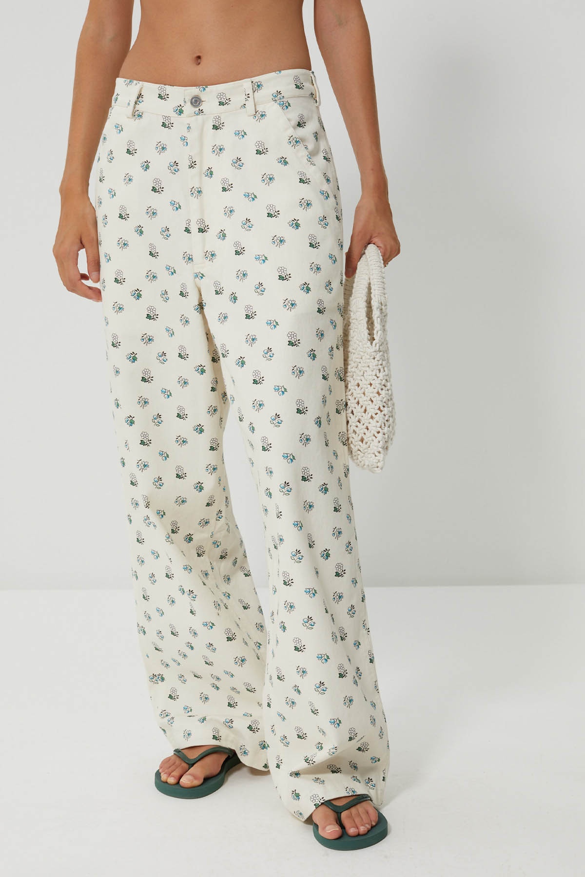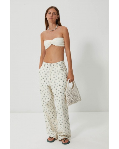 Élégance décontractée et romantisme assumé : le pantalon Ayane revisite le denim avec une touche unique douce. Confectionné dans une toile de coton écru, il est entièrement imprimé de. petites fleurs et feuillage vert, pour un look vintage et printanier.