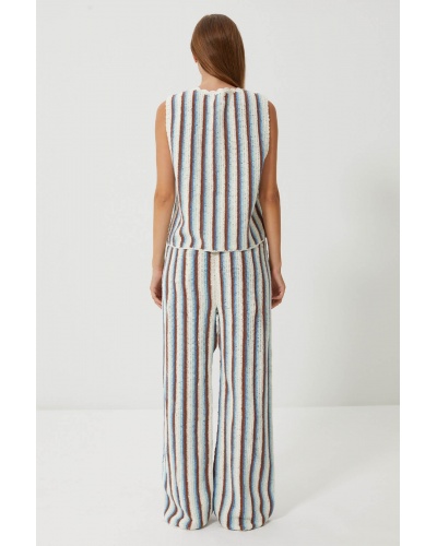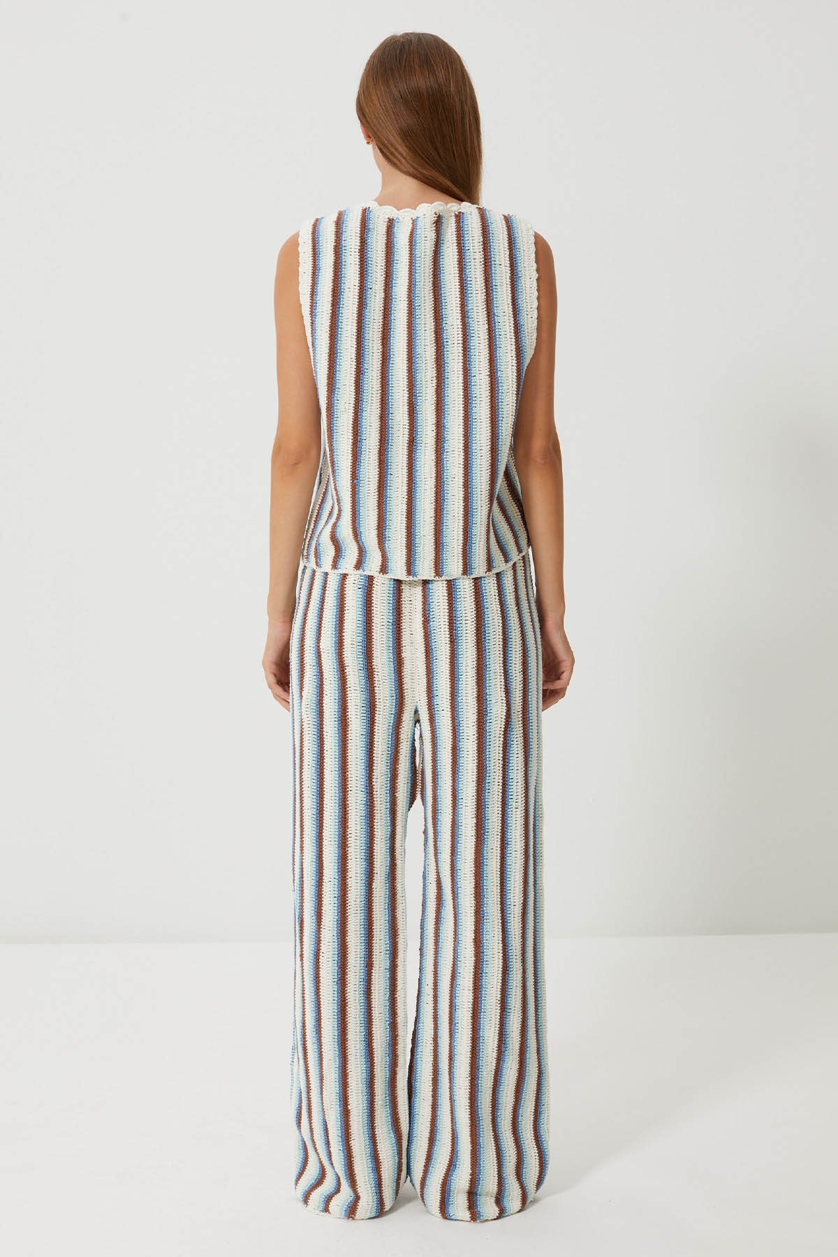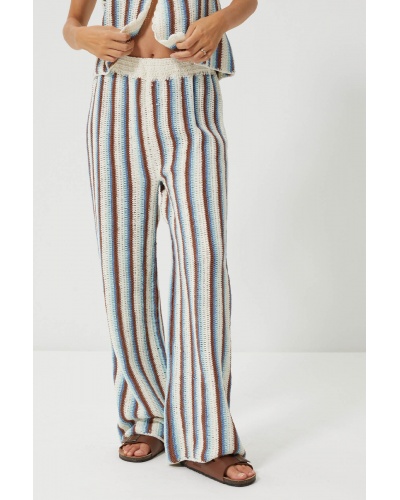Un vent seventies souffle sur l'été avec le pantalon Gacha. Entièrement crocheté, il séduit par ses rayures colorés et son allure fluide à la coupe légèrement évasée.