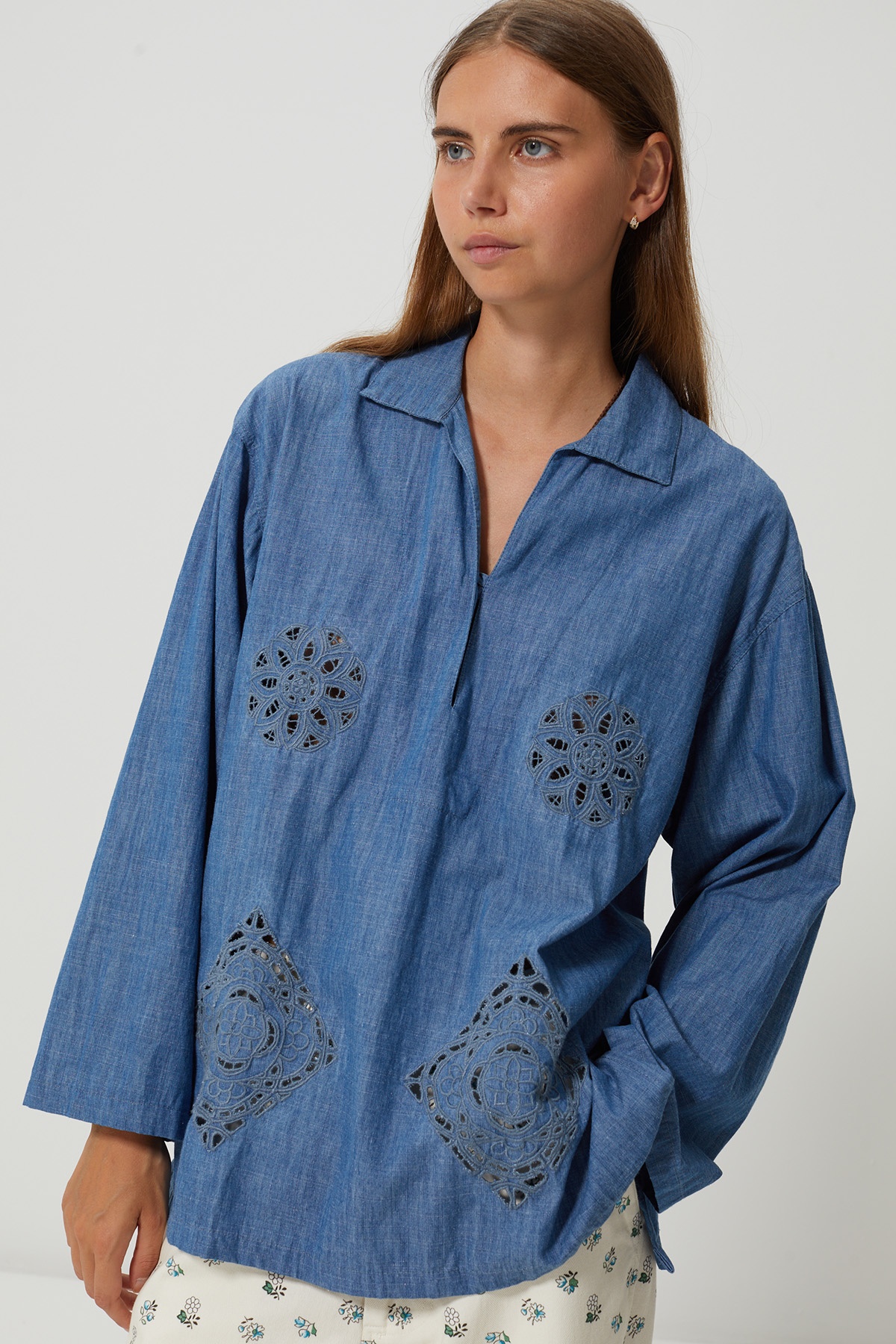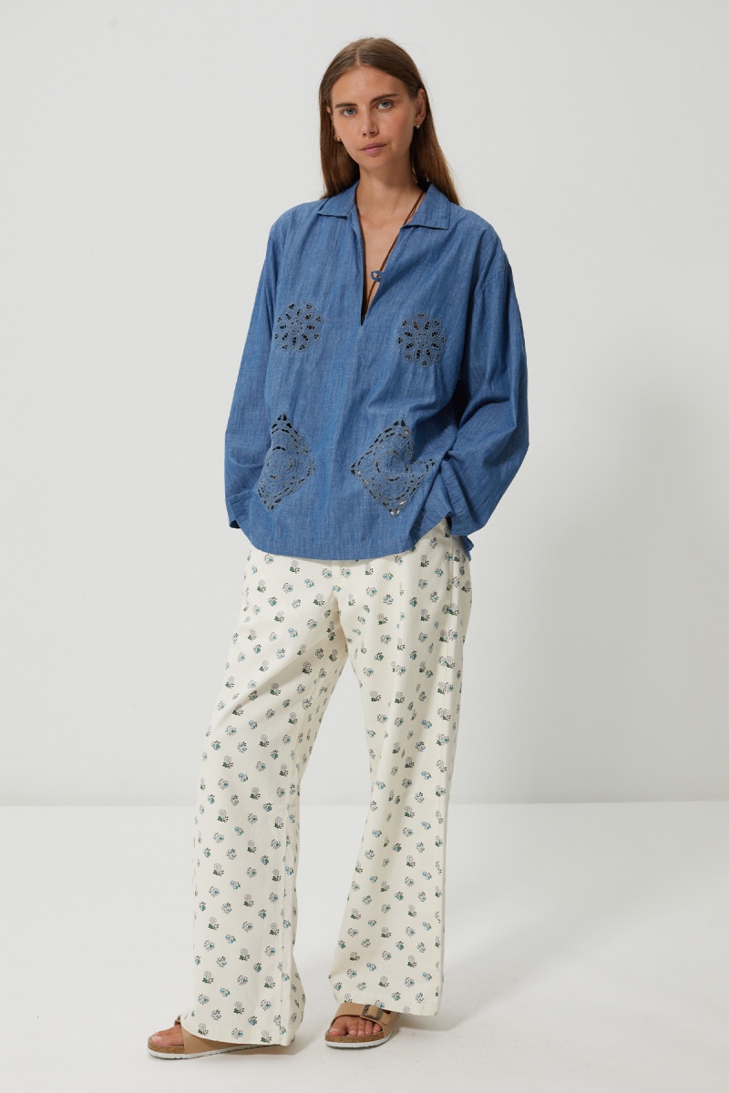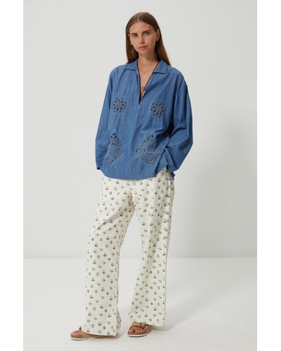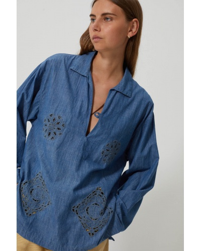 Le top Gomorah conjugue le charme et la simplicité entre ses broderies ajourée et sa matière denim léger. Sa coupe droite légèrement ample s’adapte à toutes les morphologies, tandis que ses motifs dévoilent subtilement la peau, pour un effet raffiné et moderne.
