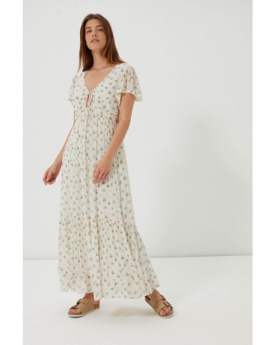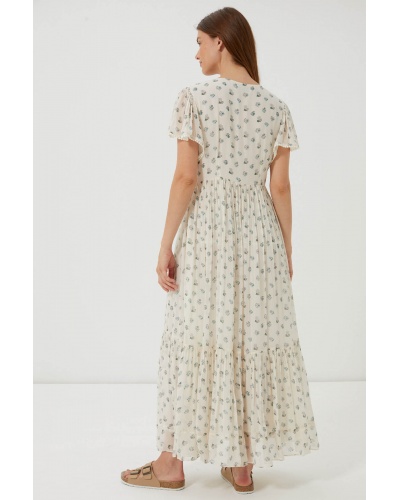 Découvrez la robe Vittoria, à l'esprit bohème empreinte d'une féminité douce. Elle séduit par sa coupe fluide, sa taille empire soulignée par une couture sous la poitrine, et ses manches courtes façon papillon délicatement bordées de dentelle.