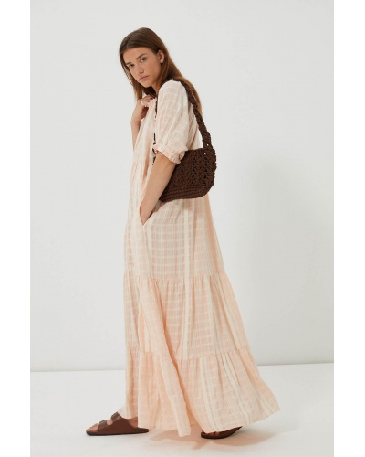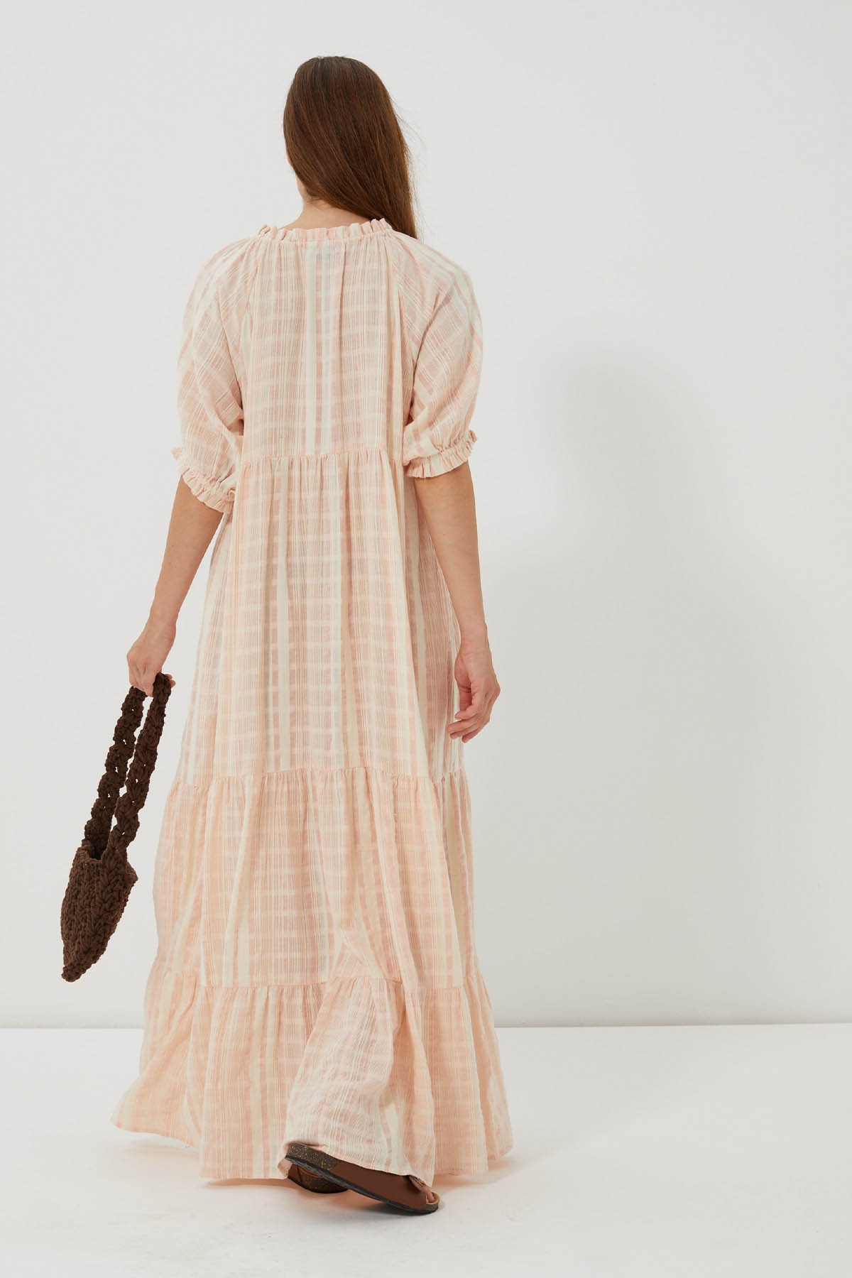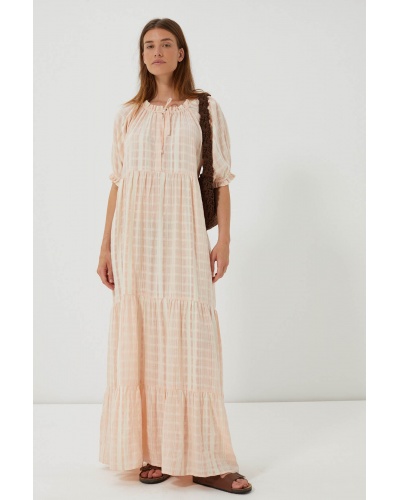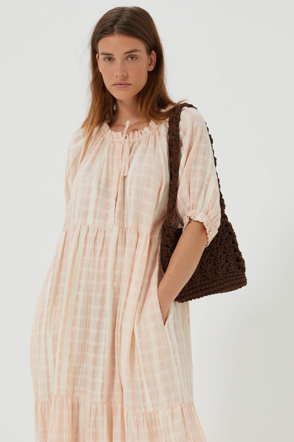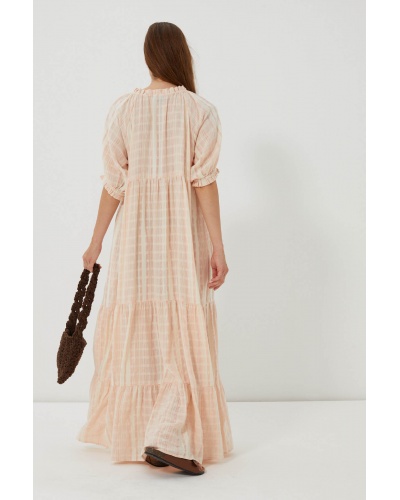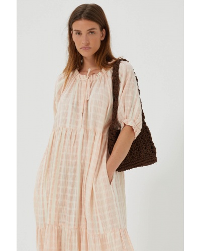 Douceur, volume et confort : la robe Kiera incarne l’élégance sans effort. Confectionnée dans un coton légèrement texturé, elle séduit par sa coupe longue fluide et son motif discret.