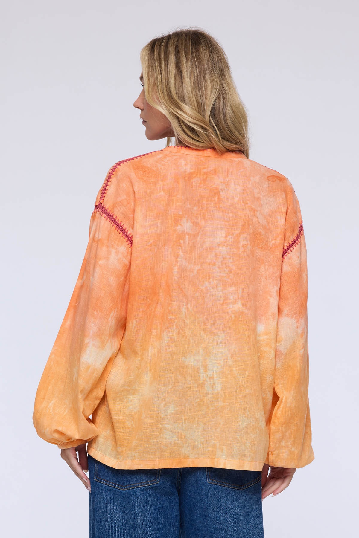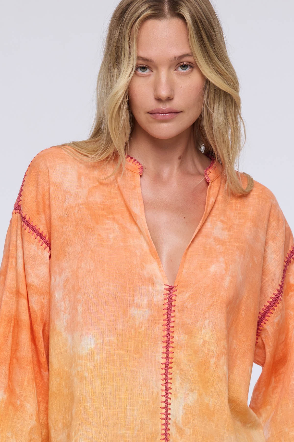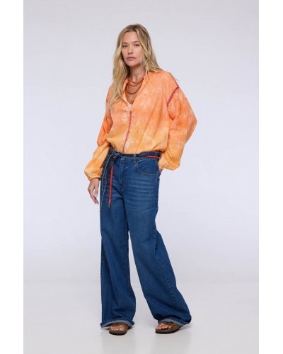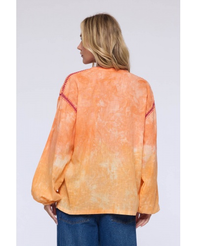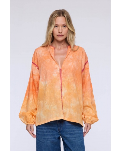 La blouse Bandeja illumine le vestiaire estival avec sa teinte orange nuancée aux subtils effets tie & dye. Confectionnée dans une matière légère, elle offre un tombé fluide et un confort absolu, idéal pour les journées ensoleillées.