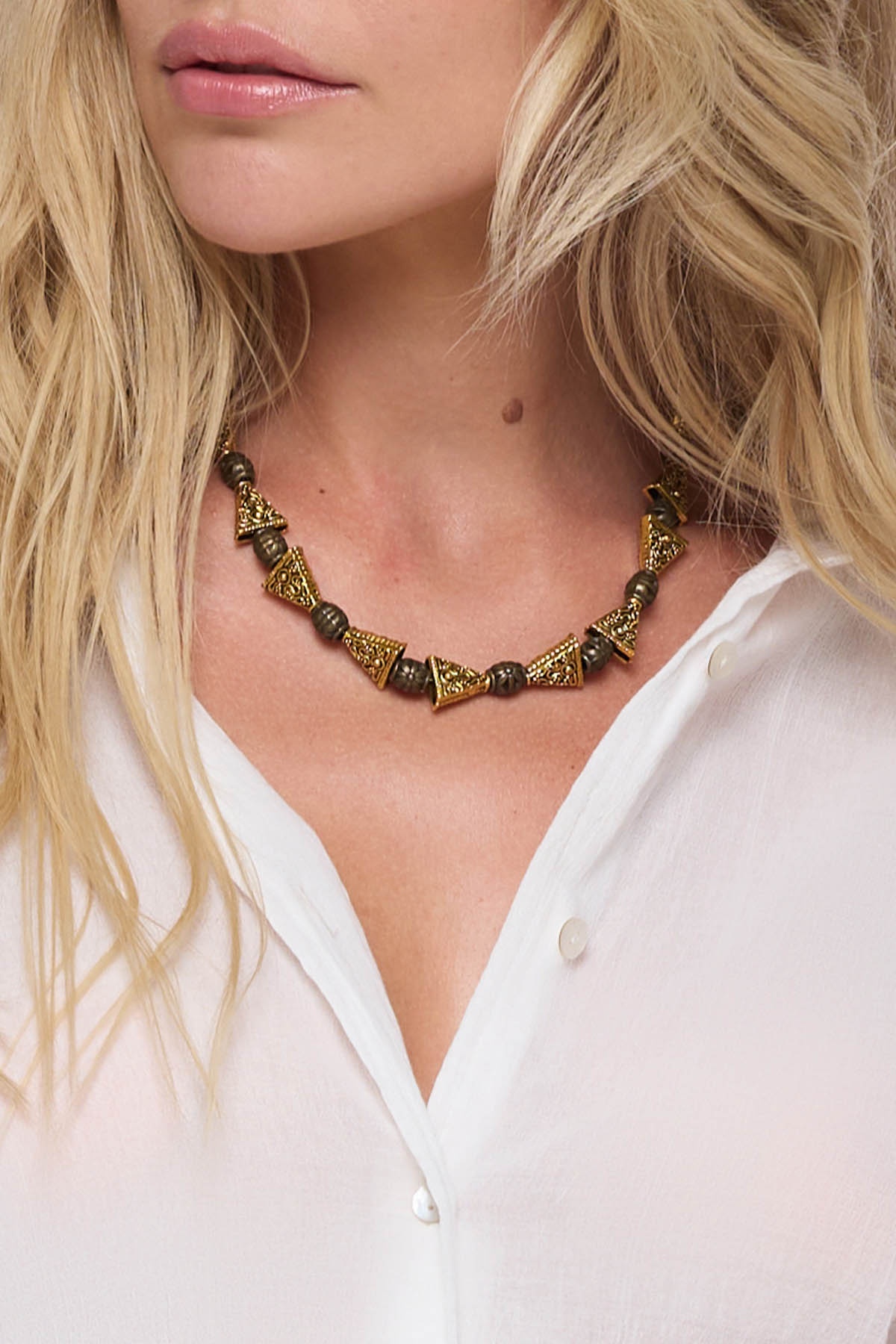 Ce dernier dessine une ligne graphique autour du cou et sublime aussi bien un décolleté qu’une encolure plus sobre. Son équilibre entre textures et matières lui confère un caractère à la fois bohème et sophistiqué.
