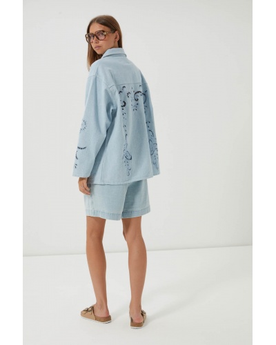 Sa teinte denim clair lui confère une touche casual et intemporelle, idéale pour des looks décontractés ou plus sophistiqués.
