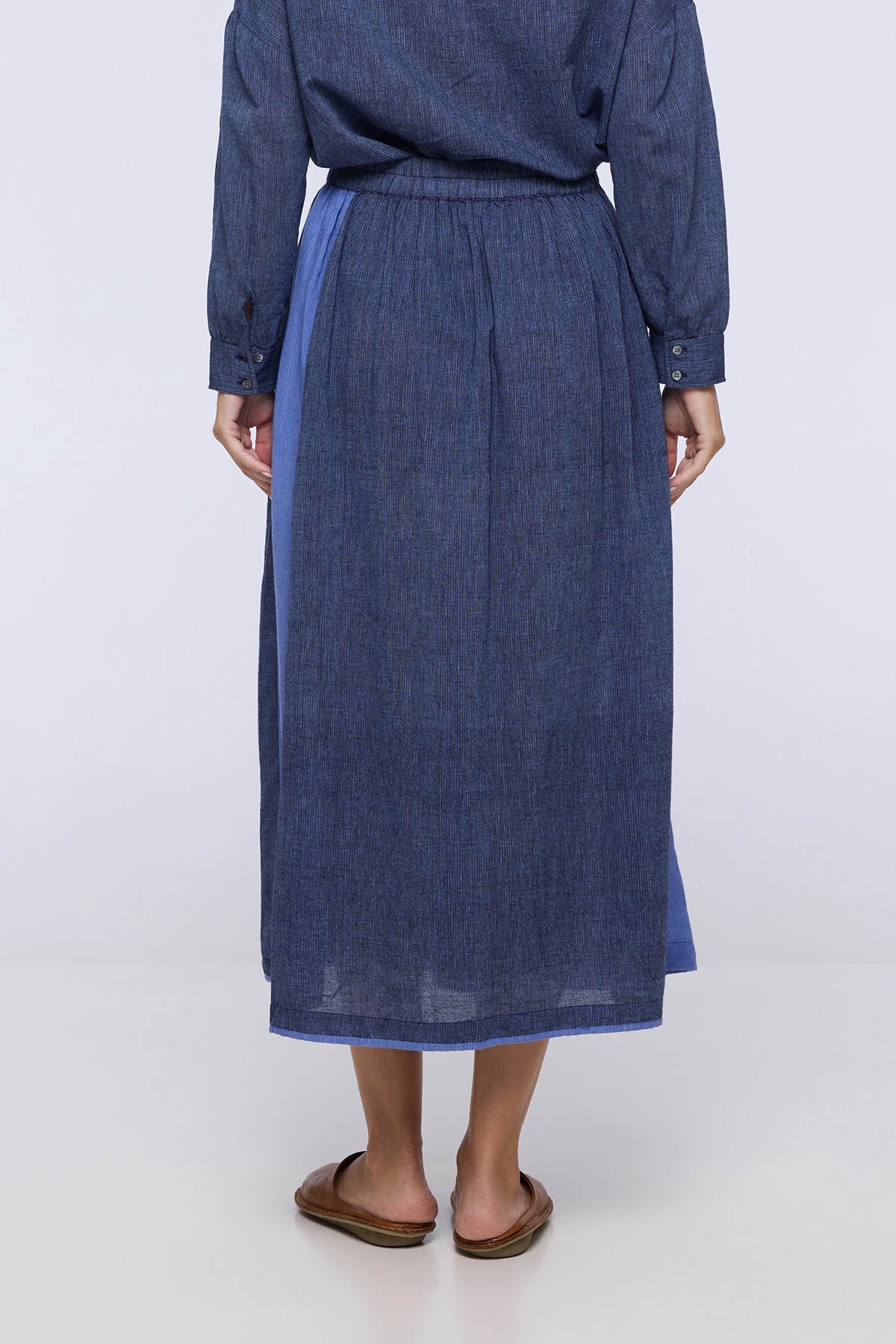 Sa coupe midi fluide flatte la silhouette tout en permettant une grande liberté de mouvement. Son design se distingue par des bandes bicolores subtiles qui créent un effet visuel vertical, allongeant naturellement la silhouette.