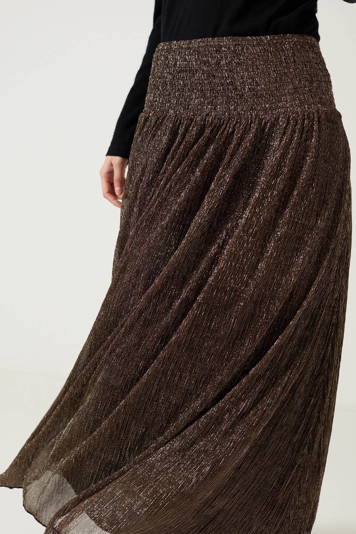 La jupe Assia se distingue par son allure fluide et son tissu scintillant subtilement métallisé.