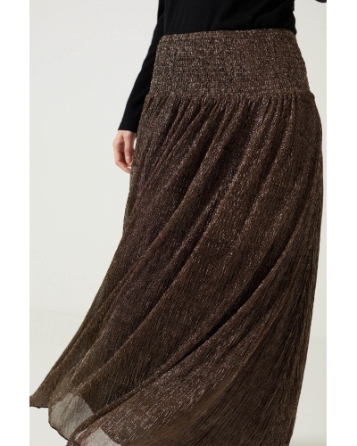 Avec sa taille smockée ultra-confortable et sa coupe longue aérienne, elle incarne l'élégance sans effort. Parfaite pour une silhouette féminine et dansante, elle capte la lumière à chaque pas grâce à ses reflets dorés sophistiqués.