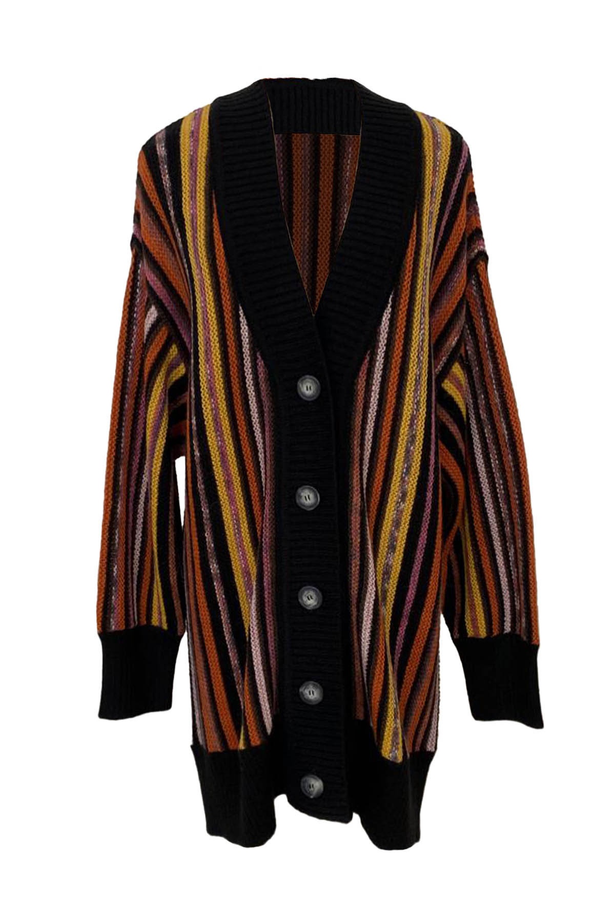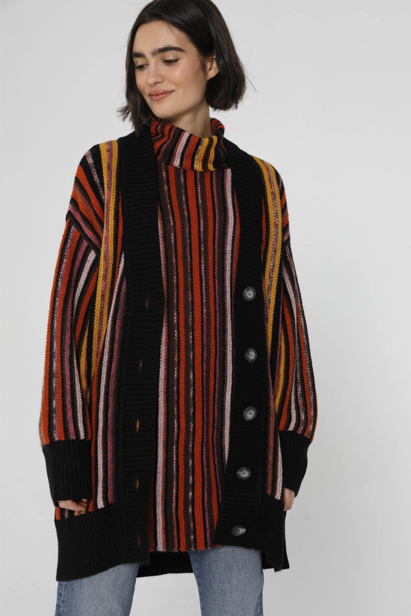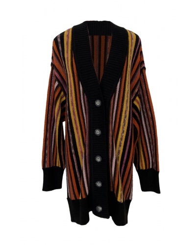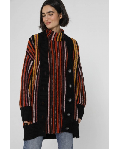 Le cardigan Damas est la fusion parfaite de style et de chaleur. Ses rayures vibrantes s'associent à un bord-côte noir pour créer une pièce de mode audacieuse.