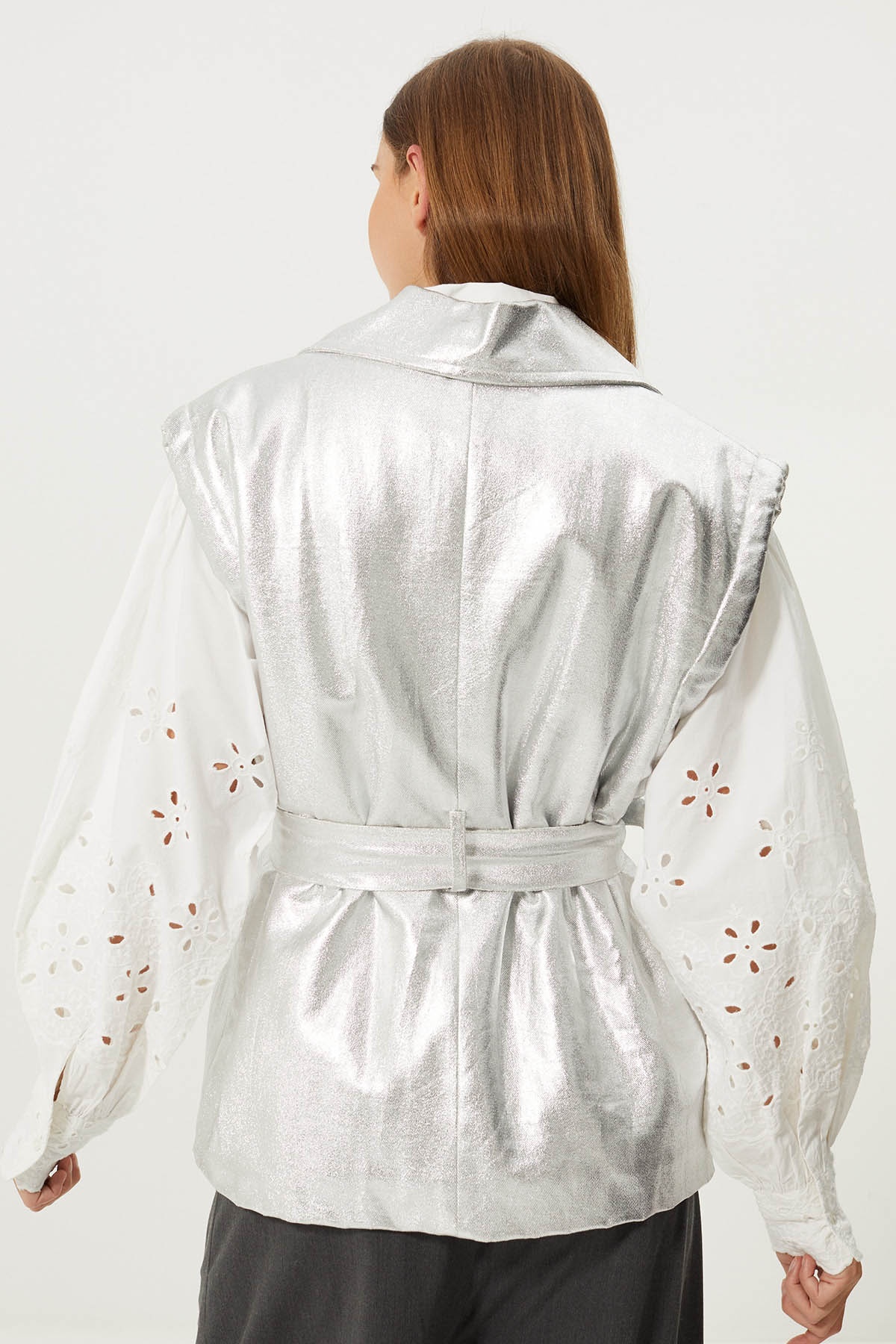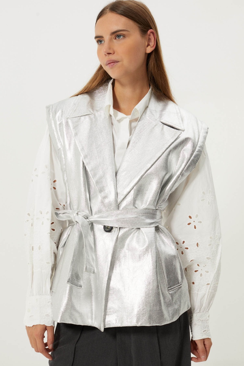 Son col à revers large et sa coupe droite offrent une silhouette moderne et structurée, tandis que la ceinture amovible permet de souligner la taille pour une allure féminine et sophistiquée. La veste Viviana peut être portée seule ou combinée avec d’autres pièces argentés pour un look audacieux et élégant.