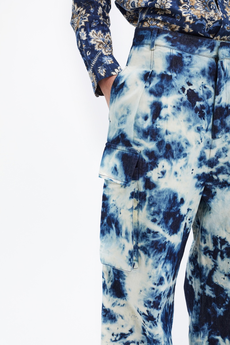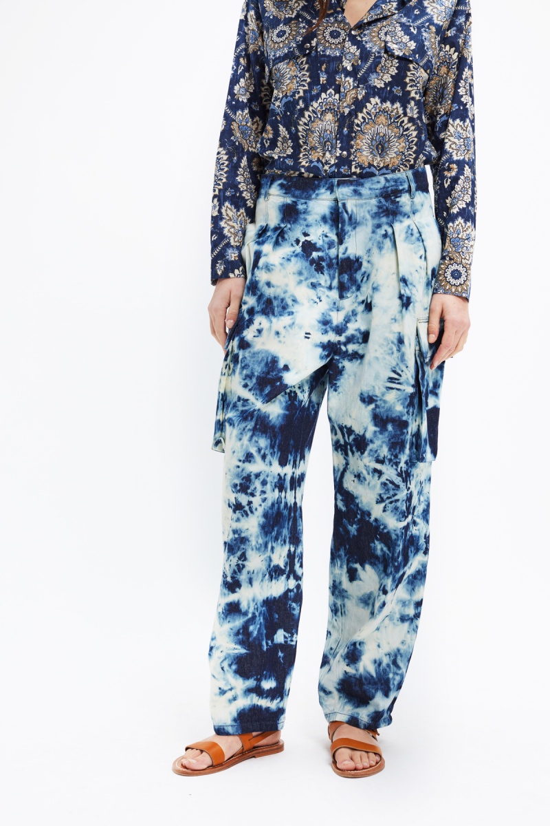 Inspiré des années 2000, le cargo à la coupe faussement masculine fait son grand retour cette année. Son tie&dye bleu aqua est réalisé à la main. Portez le, avec un tee shirt blanc et une paire de sneakers.