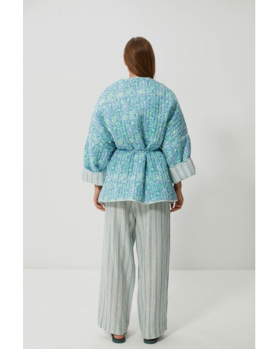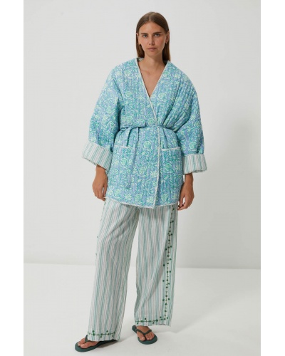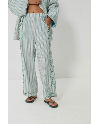 Avec ses rayures vertes et blanches et ses broderies délicates le long des jambes, il insuffle une touche bohème et raffinée à votre dressing. Confectionné dans un tissu léger et respirant, il promet un confort absolu tout au long de la journée.