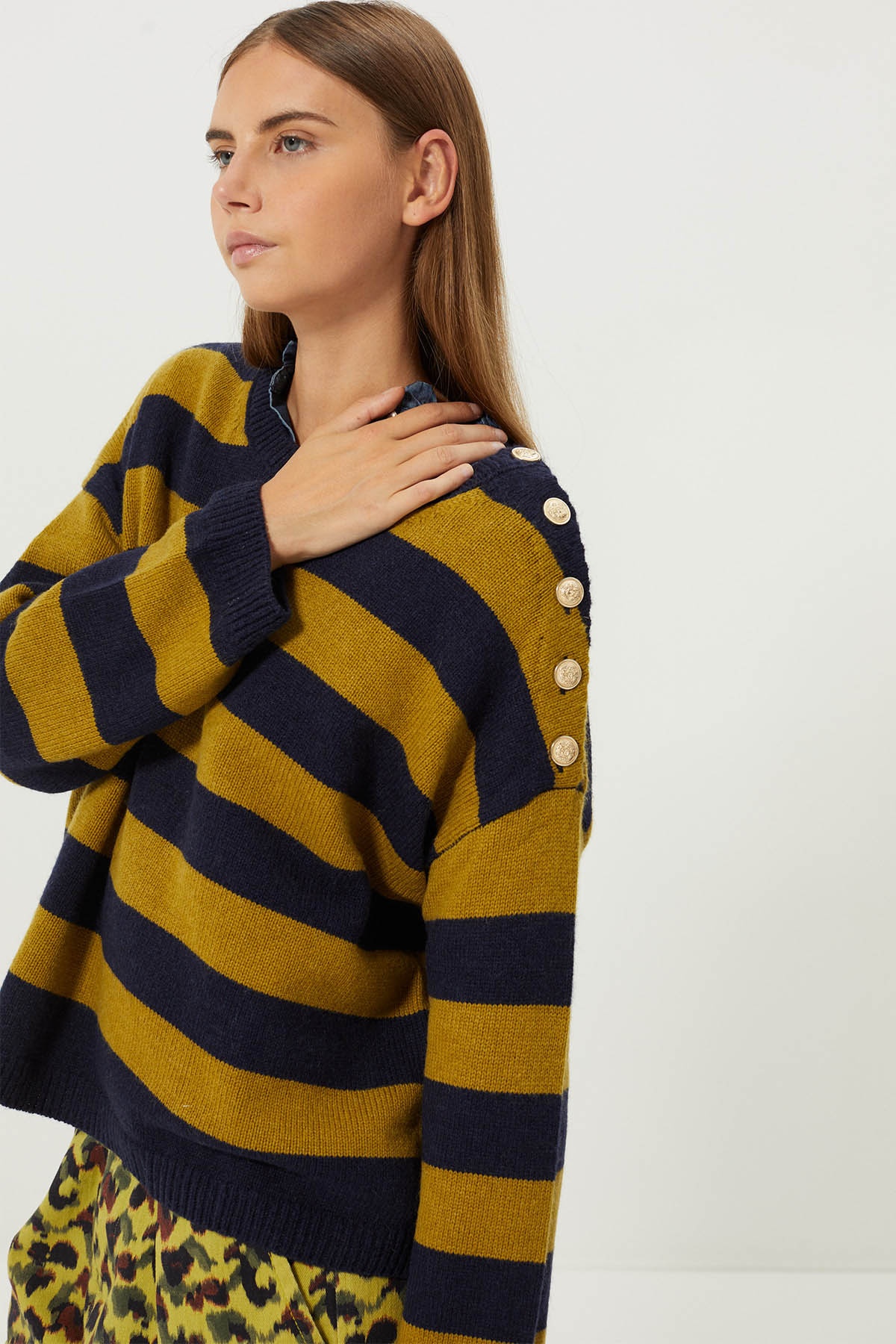Le pull Zita revisite l'indémodable style marinière avec une touche contemporaine grâce à ses rayures bleu marine et moutarde. Confectionné dans une coupe ample, ce pull assure un confort décontracté tout en offrant une allure sophistiquée.