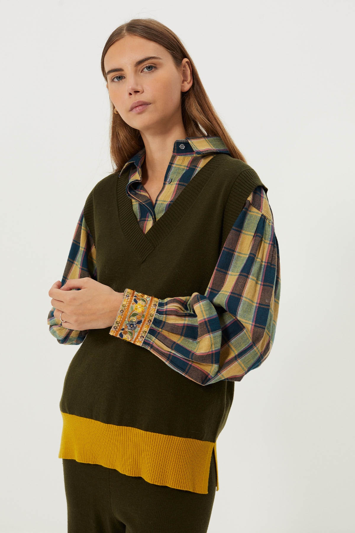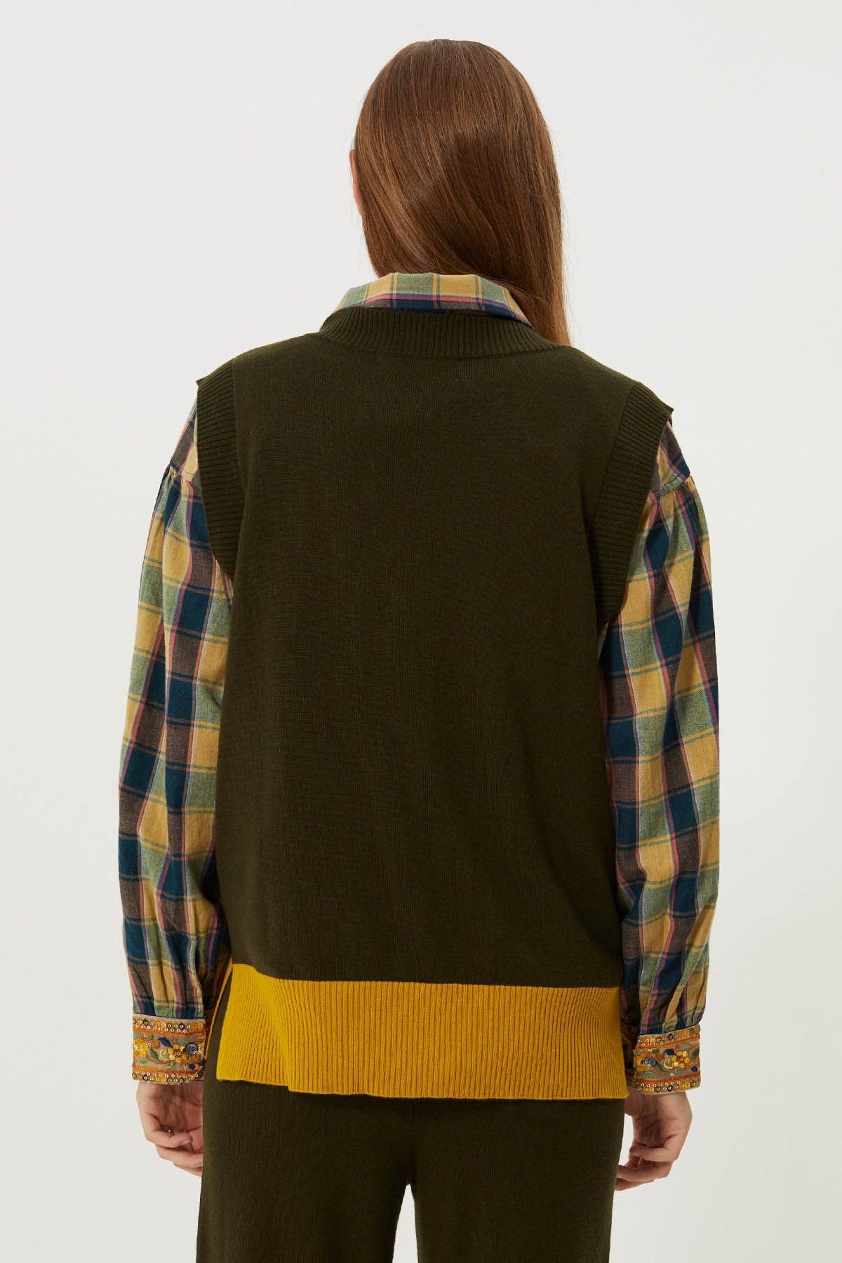 Laissez-vous tenter par le pull sans manches Santa, une pièce qui conjugue confort et originalité accentué par son design bicolore. Ce contraste de couleurs, avec une base en vert olive profond et une bordure en jaune moutarde, crée un jeu de nuances à la fois audacieux et sophistiqué.