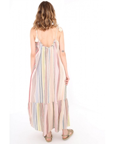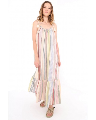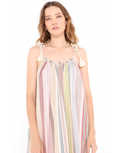 Laissez vous séduire par notre robe Andreza, ses rayures douces et son large volant font d’elle une pièce délicate et estivale. Les bretelles à nouer permettent d’ajuster selon vos envies la hauteur de la robe et de son décolleté.