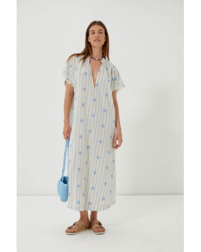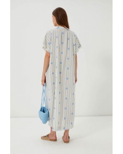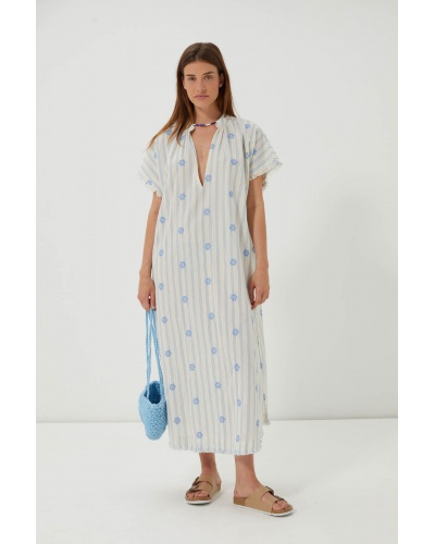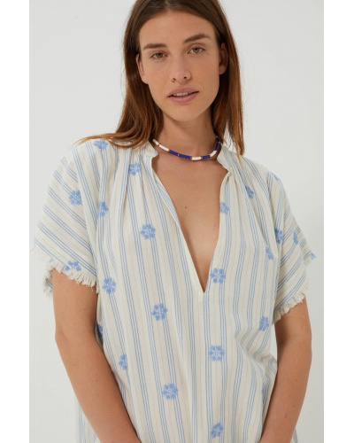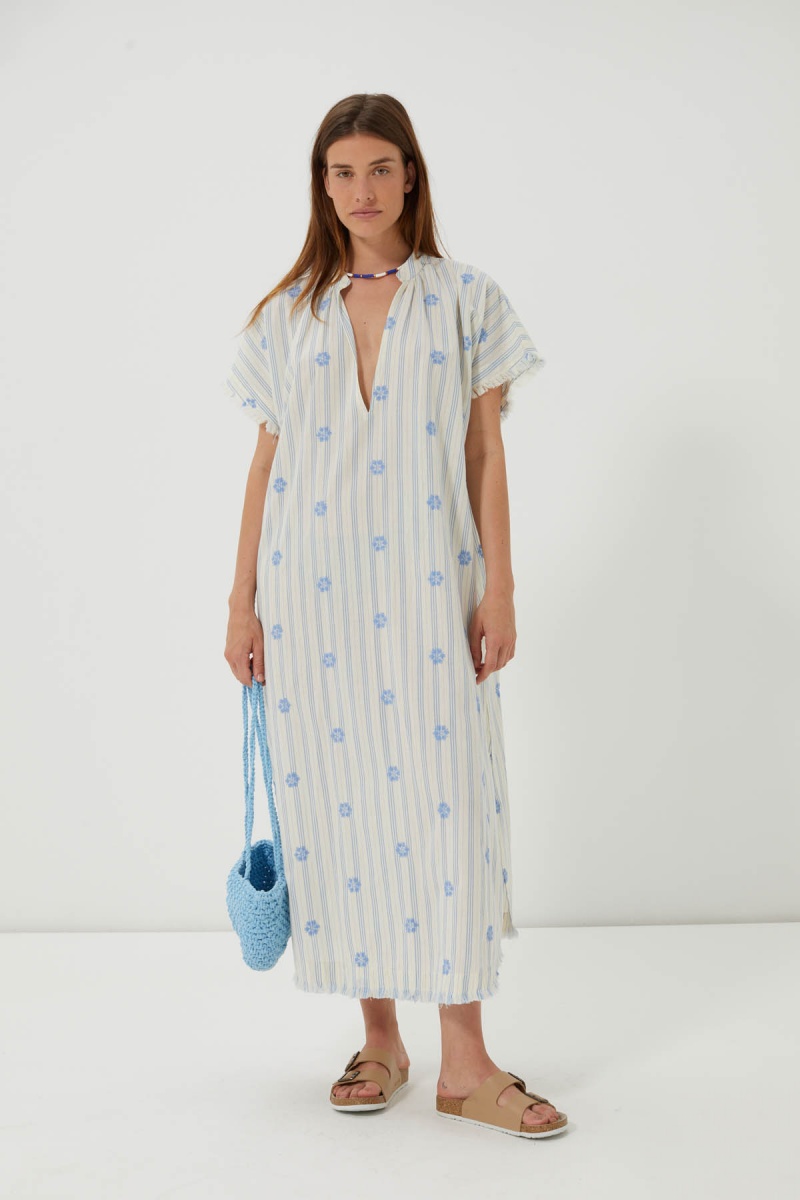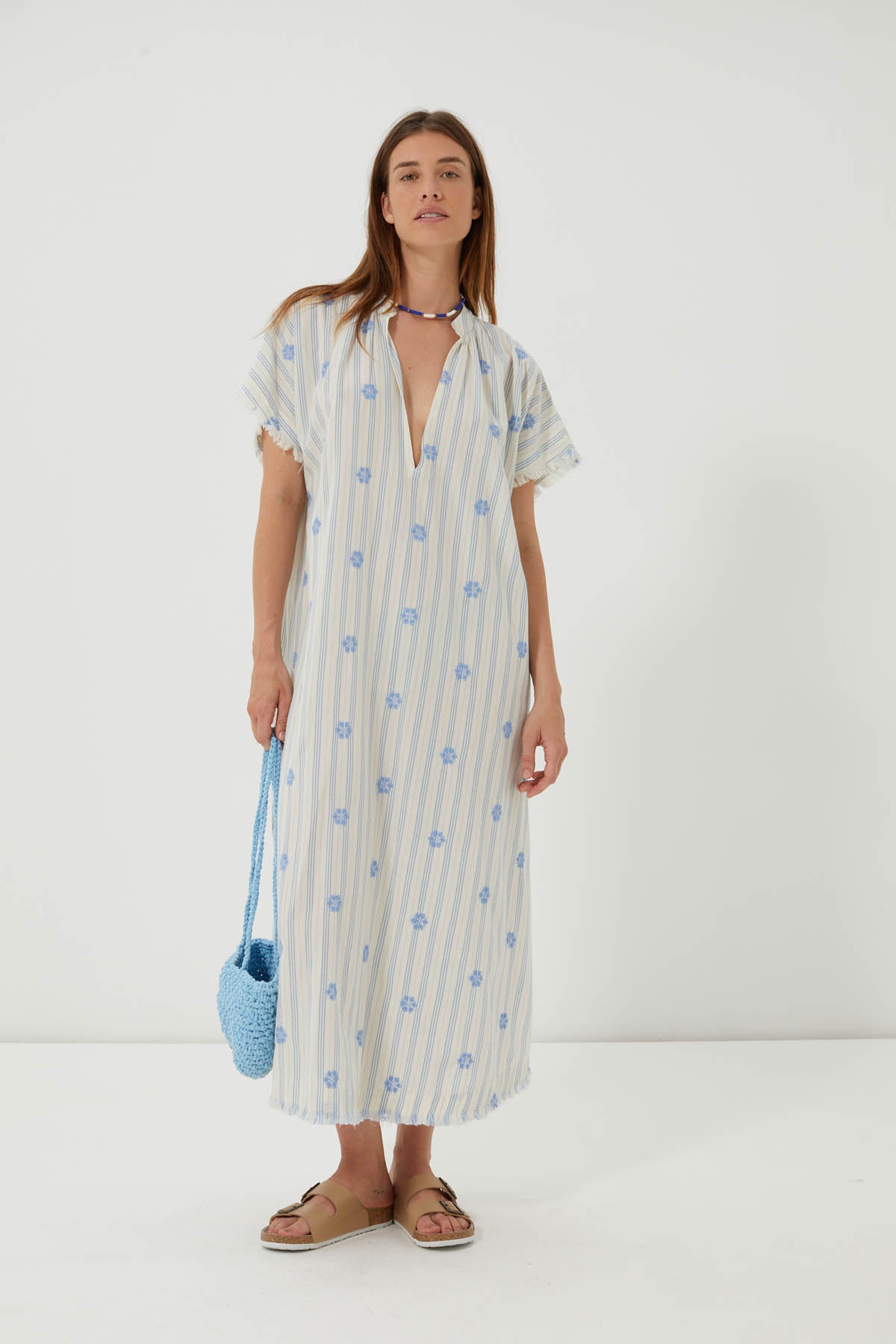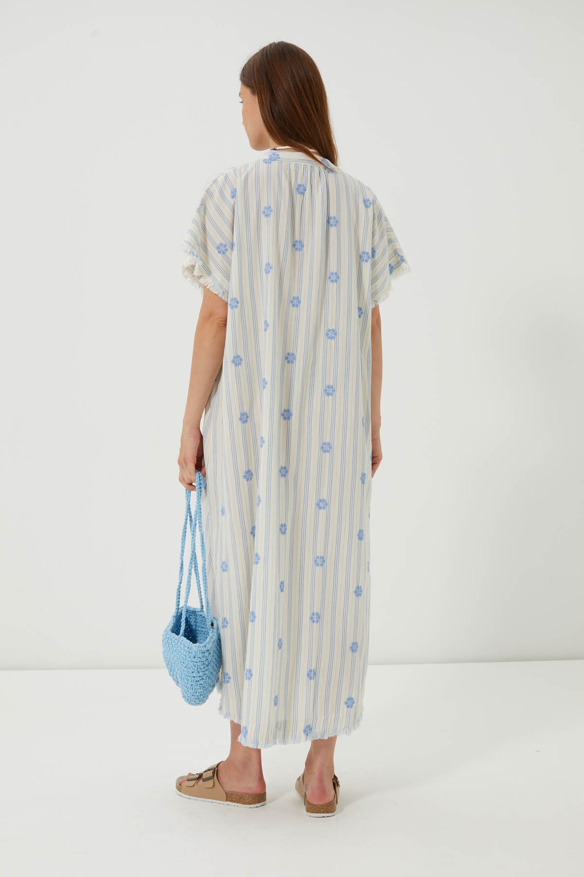 Ses bord effilochés aux manches et bas de robe accentue le côté unique et original de cette pièce. Sa broderie délicate sur ses rayures douces apporte une touche bohème et raffinée, idéale pour un style estival chic et naturel.