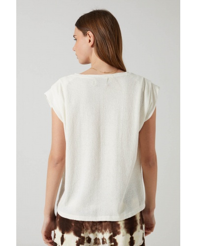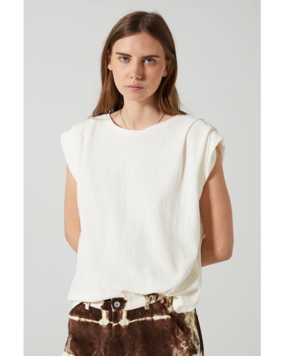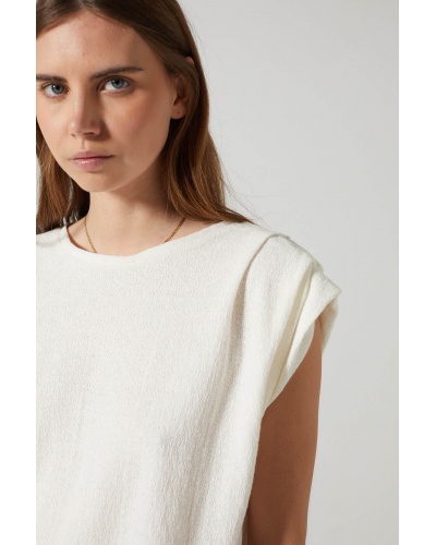 Confectionné en mélange de rami et de coton, il offre une texture qui apporte du relief et une sensation agréable sur la peau. Son design minimaliste est rehaussé par des épaules structurées, qui lui donnent une touche contemporaine et sophistiquée.