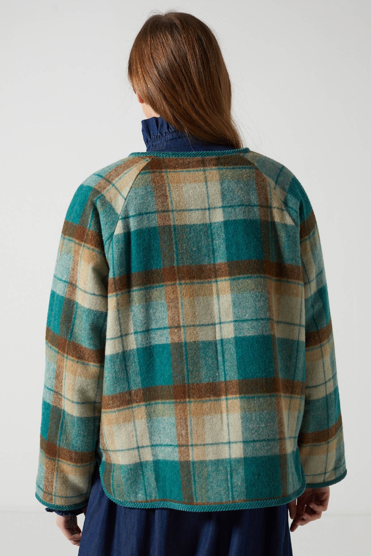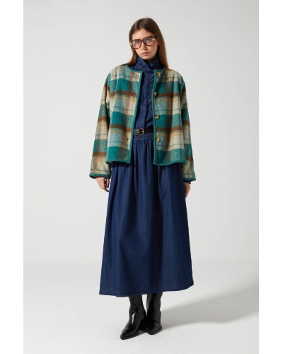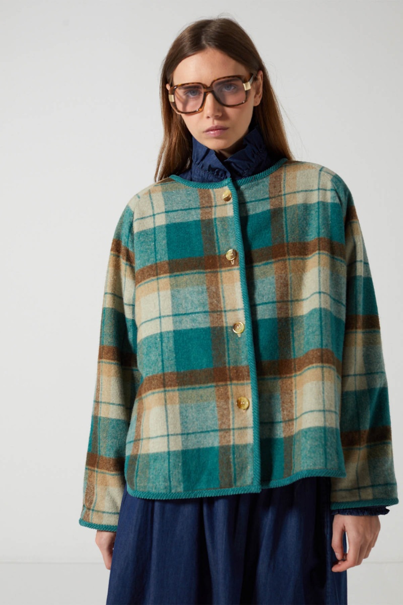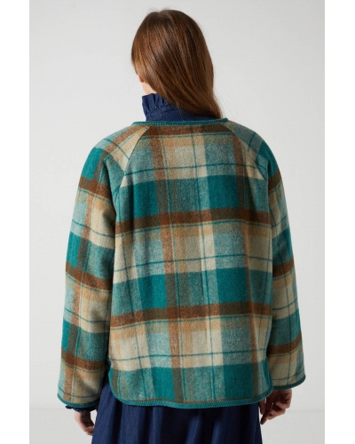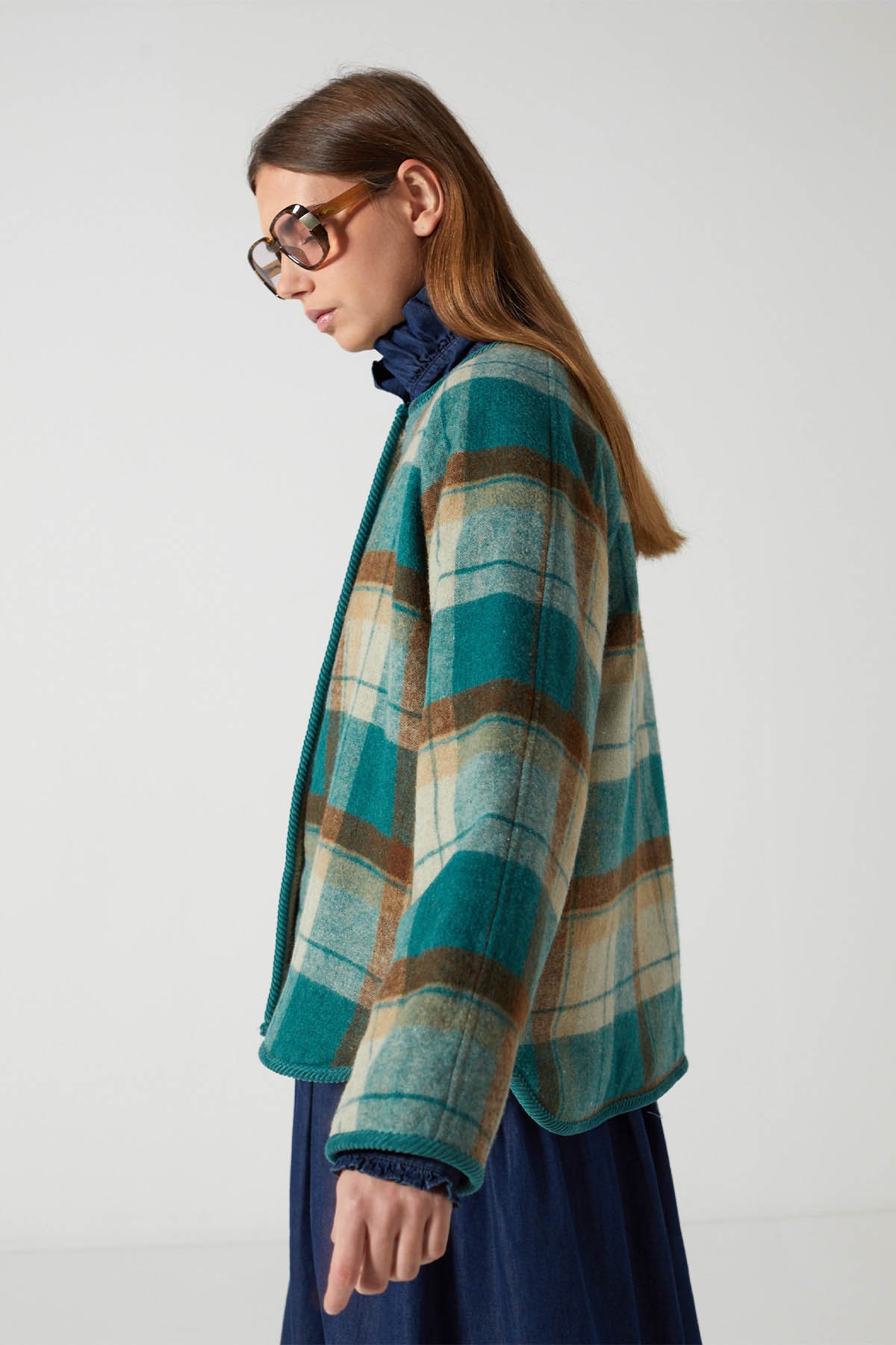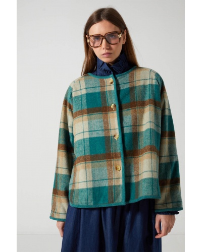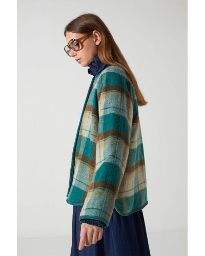 La veste Elma revisite le style rétro avec une touche contemporaine. Son motif à carreaux aux nuances profondes de vert, beige et brun insuffle une chaleur visuelle idéale pour la saison.